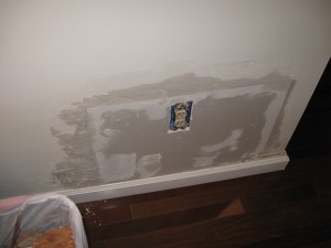 My measurements strongly suggested that the sewer pipe dropped to the basement below the hallway wall. So with yet another deep breath, I cut a hole in this wall, which I had just recently finished painting. It turned out to be some of the remaining old horsehair plaster – very fragile and unhappy at being assaulted by my hammer. My small hole soon became a spider web of cracked and crumbling plaster. Worse, the hole revealed no sewer pipe. Two holes and still no way to thread the wires.