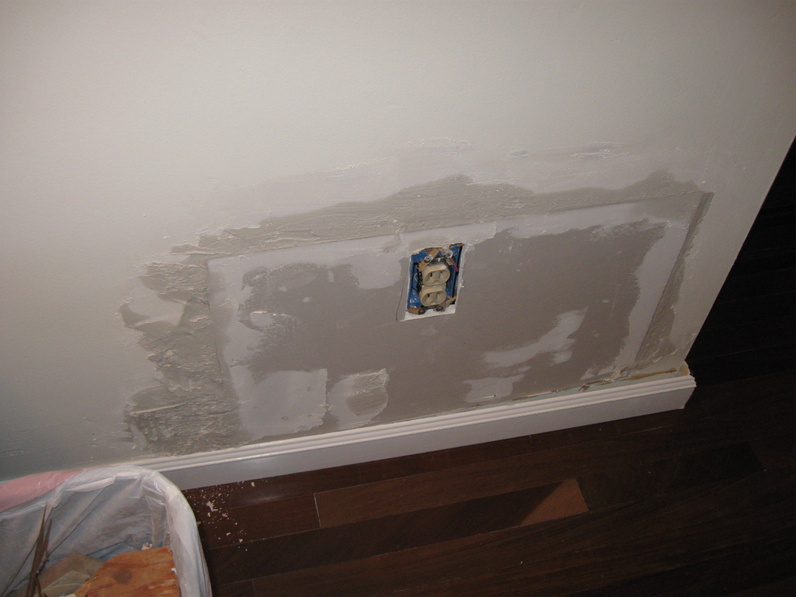 It is now Monday afternoon and I am waiting for the second coat of joint compound to dry so that I can sand and paint the patches. The hardwood floor has been reinstalled in the linen closet (I had some remaining scraps that were sufficient). I am fairly confident that I will be able to complete my half-day job within the three days of the weekend.