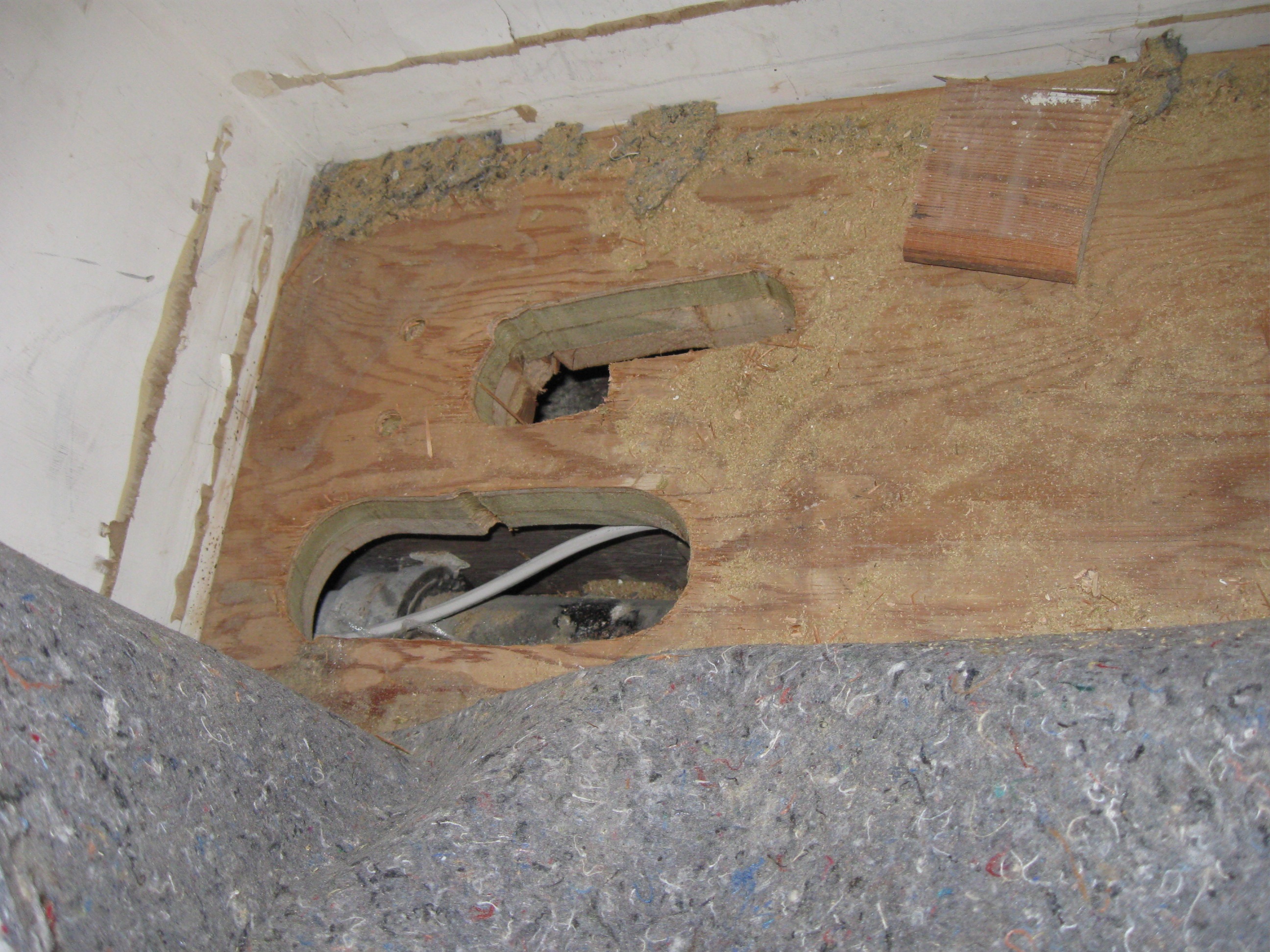 As they say in poker, I was now “pot committed” – I had invested too much to quit. The next option was to rip up the floor in the linen closet. This was new hardwood, installed just two years ago. Ripping it out was every bit as painful to me as it was to the wood. When I cut through the subflooring, the sub subflooring and the sub sub sub flooring – the floor in this case was over 3 inches thick – I realized that the hole was on the wrong side of a joist. So I cut a second hole and finally was able to see where the sewer line dropped down. Unfortunately it was indeed under the wall and not directly accessible. I thought, though, that if I could run the conduit up the shaft, I could reach over and grab it.