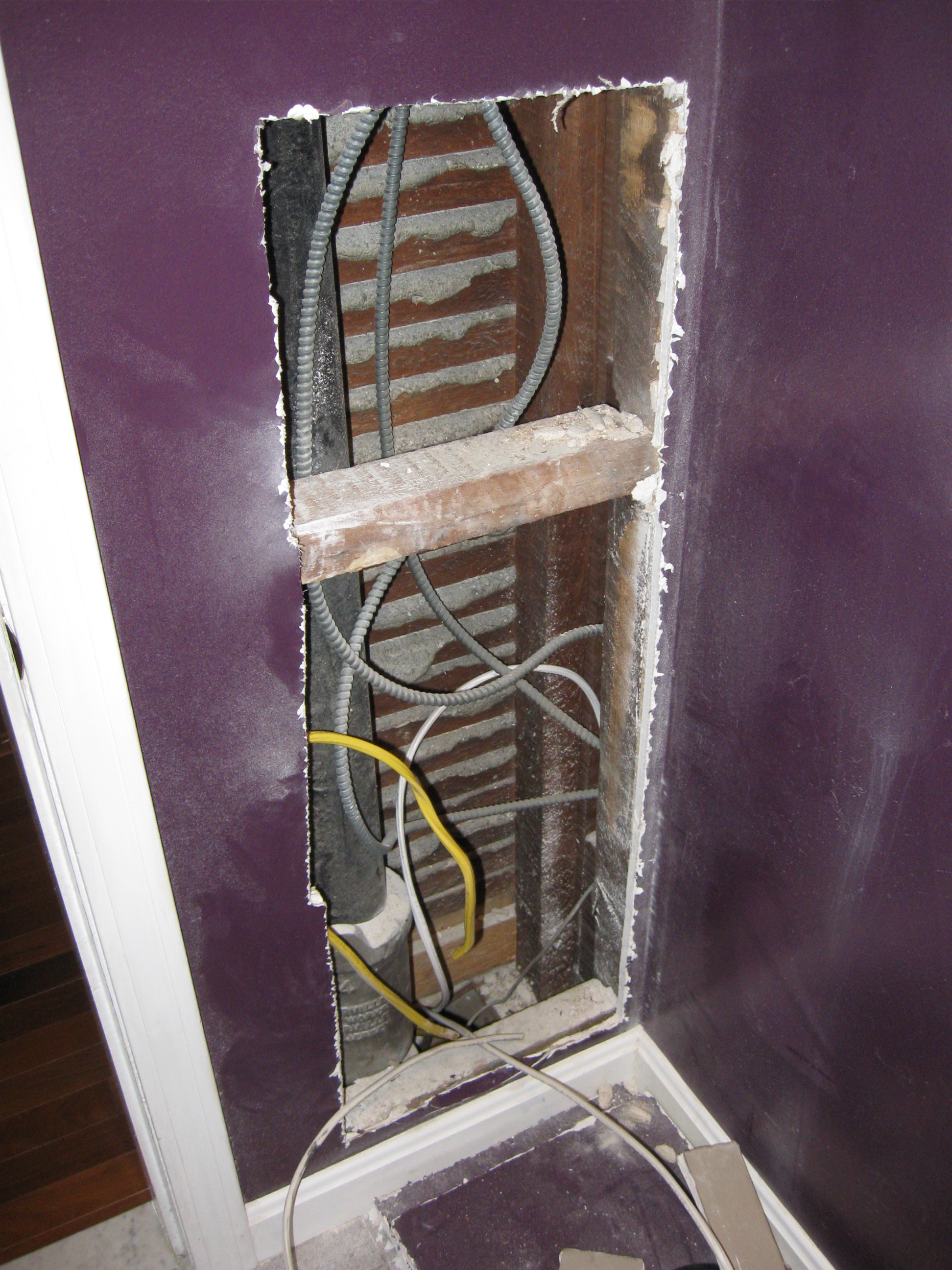 Things began to go wrong when I cut the small hole in the bathroom wall. Looking down into the wall and seeing the jumble of old construction debris and not much else, I knew immediately that the hole would need to be much larger. Making it a foot square didn’t help much, so I took a deep breath and ripped it open to the baseboard.