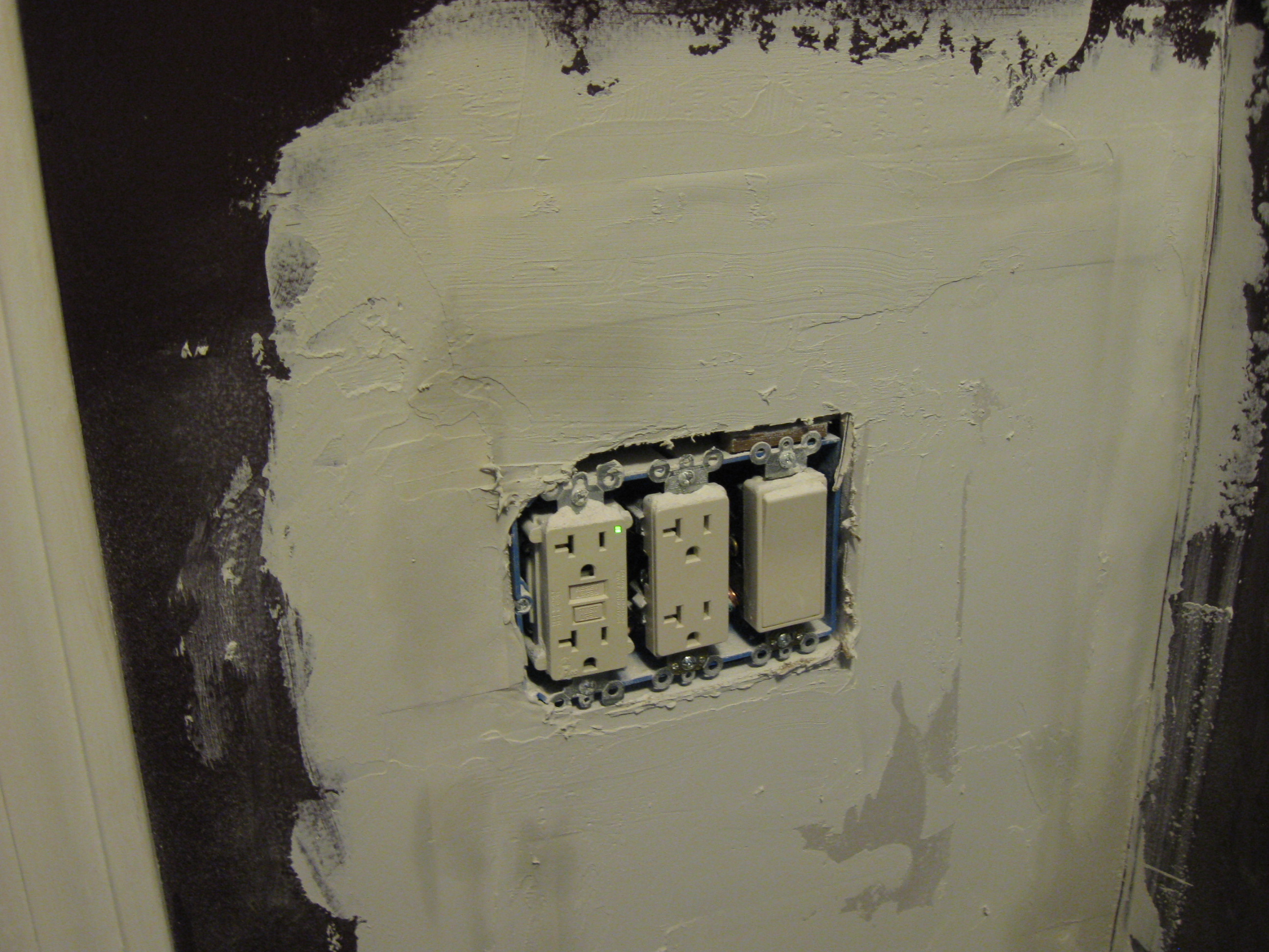 The rest of the job was fairly straightforward. I looked at the hole in the hallway wall as an opportunity. Hell, we needed another outlet in the hall, too, so when I wired the bathroom outlet I ran a line back under the linen closet floor and threaded it through to the hallway hole. I am still patching the wall, but we now have a second functioning outlet in the hall.