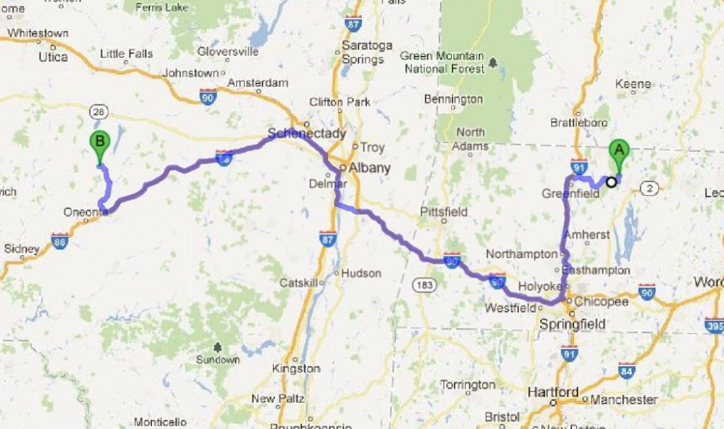 219 miles via MA 2, I-91, I-90, I-87, I-88 and NY 28. Cumulative distance: 324 miles.