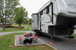Our home on this hop has been The Country Waye, our first KOA campground. I got the Good Sam discount, but it was still pricey: $48.51 per night. But very nice. It has beautiful landscaping and many level gravel pull-thru sites. Every site has a picnic table and firepit and – this really catapulted it to the top of the dogs’ list of favorite places – a huge fenced-in dog run. Grace, when let off the leash, set a new land speed record for canines as she raced from one end to the other. I think she would have done well at Wonderland, if she could keep up that pace for a quarter mile.