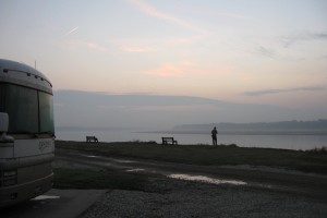 This morning we were treated(?) to the opposite: a violent, windy thunderstorm before dawn. Gusts of over 40 mph rocked Patience and woke us at 5am. I had to scramble to close the windows (it was a warm night) against the horizontal rain that was pelting the RV. And during a short lull I had to go out and retrieve the extra sewer hose that I had left, unattached, under the RV – it had blown to the adjacent site.