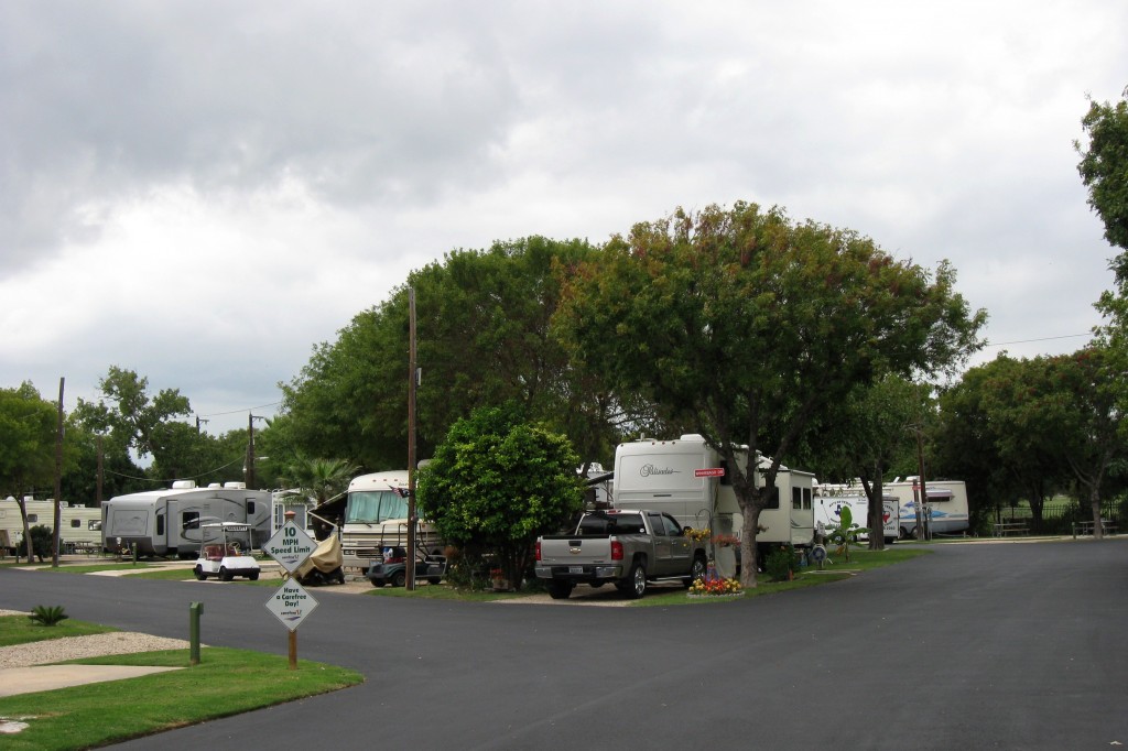 Our home for the two night in San Antonio was the Traveler’s World RV Resort, a sister property to the park we inhabited in Austin. This park, like the one in Austin, was very clean and well-maintained. The pads were gravel, but were very carefully raked – the rake marks were very prominent. The park was nearly full (and we need to vacate our spot today because they only had a pull-thru site for 2 days). I already mentioned that a golf course is next door and I already regret not using it.