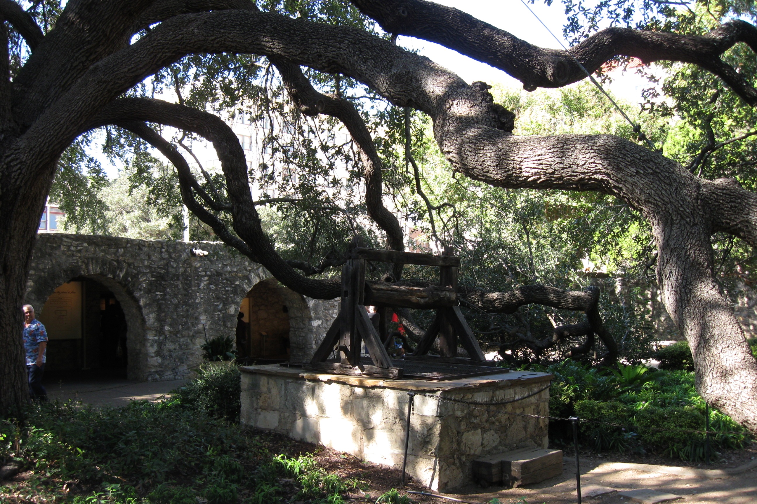 The grounds were very nice. None of the vegetation was there in 1836, of course, but the Alamo is now a serene city park. I particularly liked the cactus, the tree with limbs so long they needed supports, and the old well.