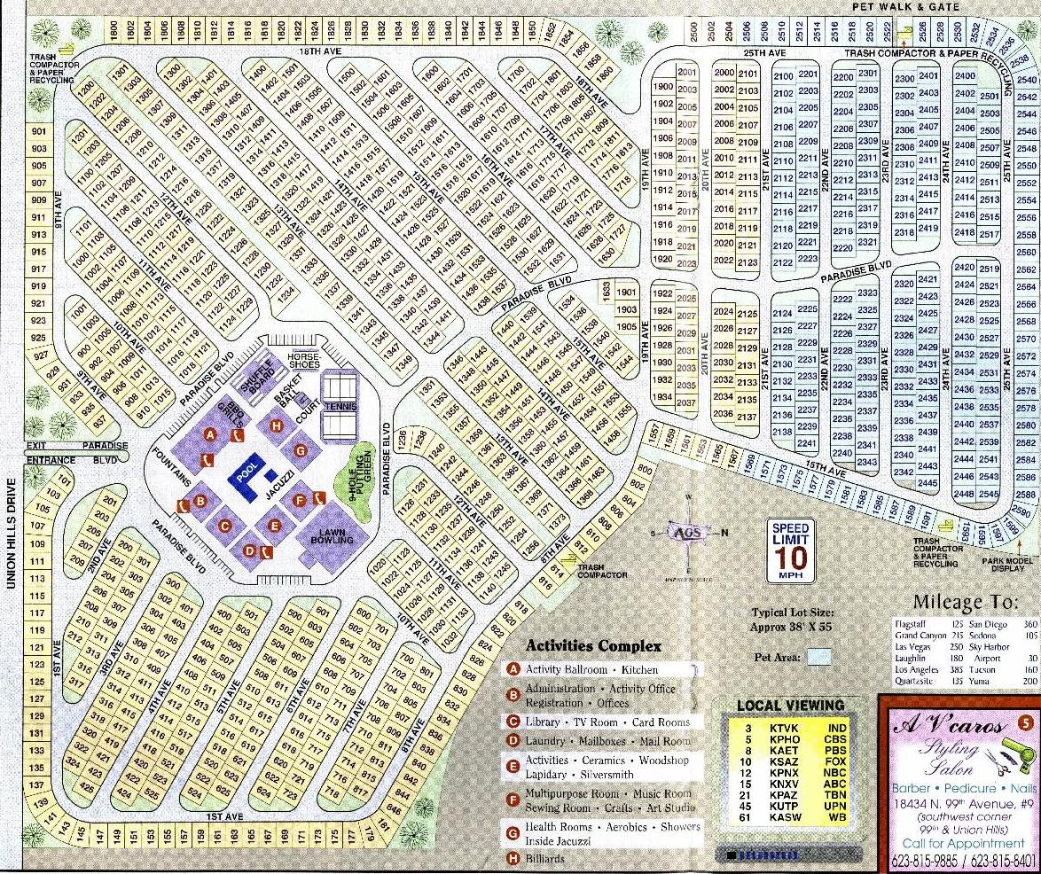 We opted for a good night’s sleep, vacated the “Whispering” Palms park and hot-footed it up to Sun City. I found that Phoenix is snowbird central: it has numerous mega-parks that cater to long-term occupants. They look more like trailer parks than RV parks. Many have over 1,000 sites and one has nearly 2,000. Because they are designed for long-term residency, vary few pull-through sites exist. I finally convinced Jett that a back-in would be fine as we would be staying for 4 nights. I thought I opted for one of the “small” parks – just 144 sites. But that was 144 transient sites; it has many more long-term sites. I haven’t seen a full count, but you can estimate from the map. Our site number – 2126 – suggests that the park might contain nearly 1,000 sites.