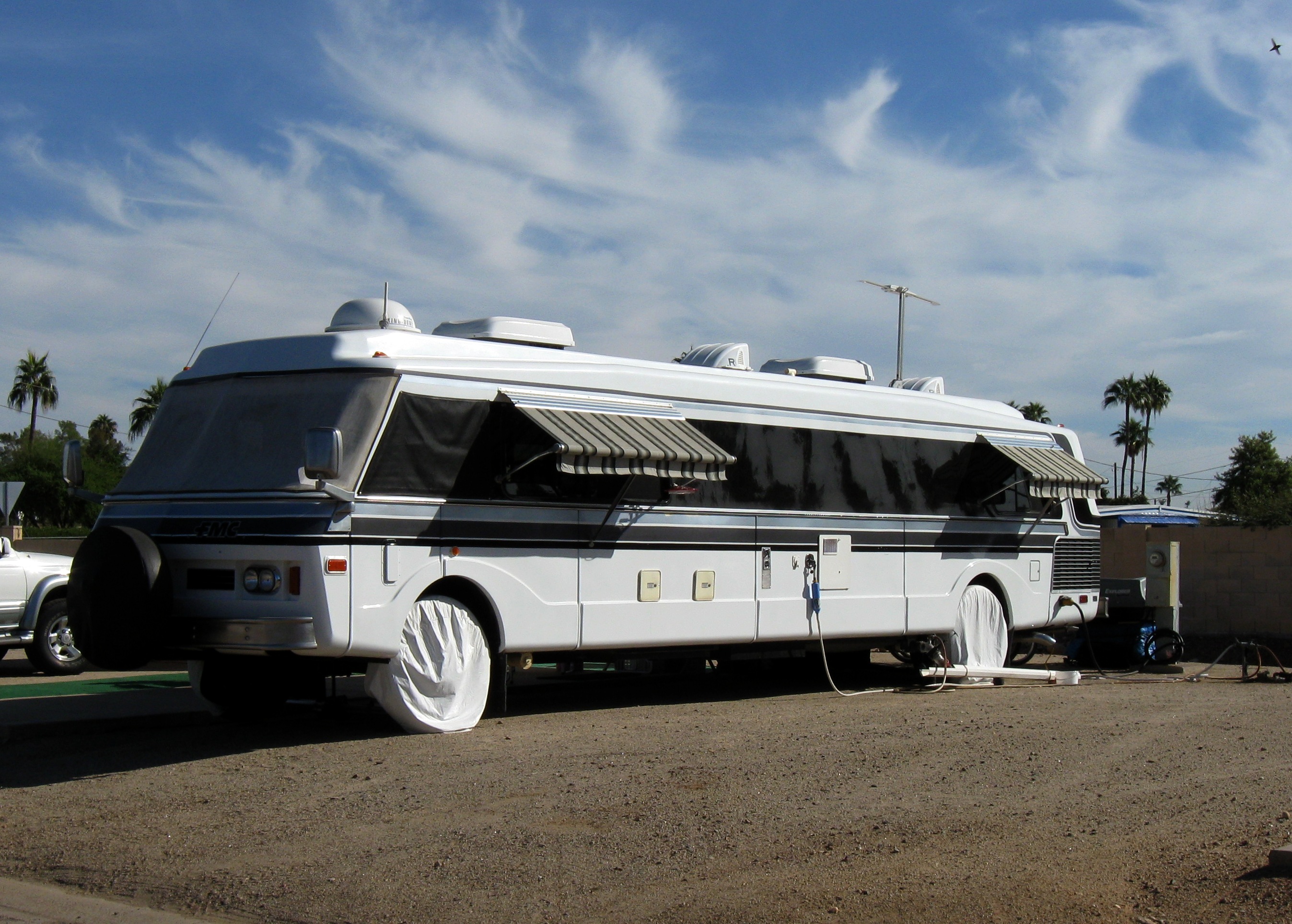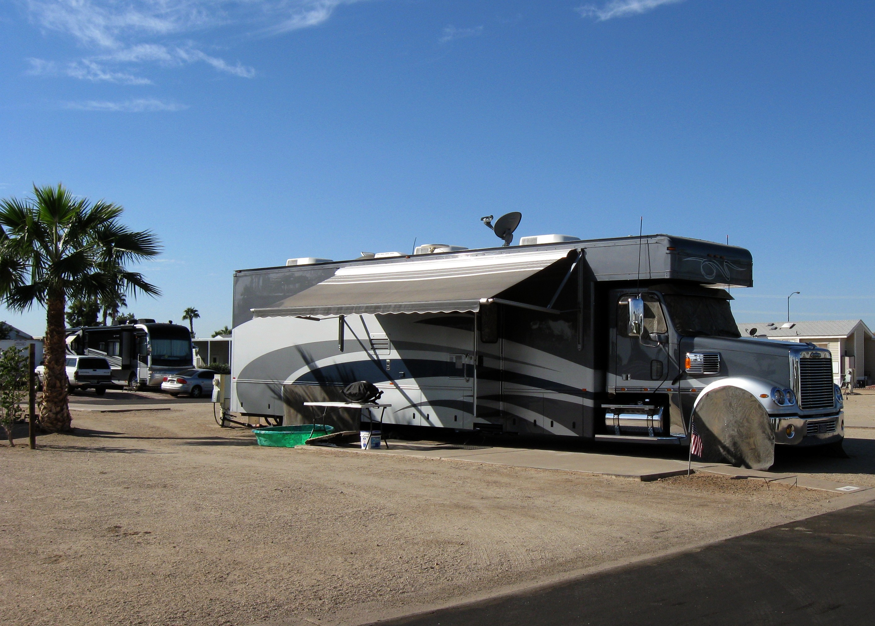 Most of the long-term residents live in park model trailers, but a few are in motorhomes. There were a couple of interesting ones that we saw here. One looked like a stretch limo. The other was a Freightliner chassis with a motorhome body – a very odd hybrid of Class A and Class C.