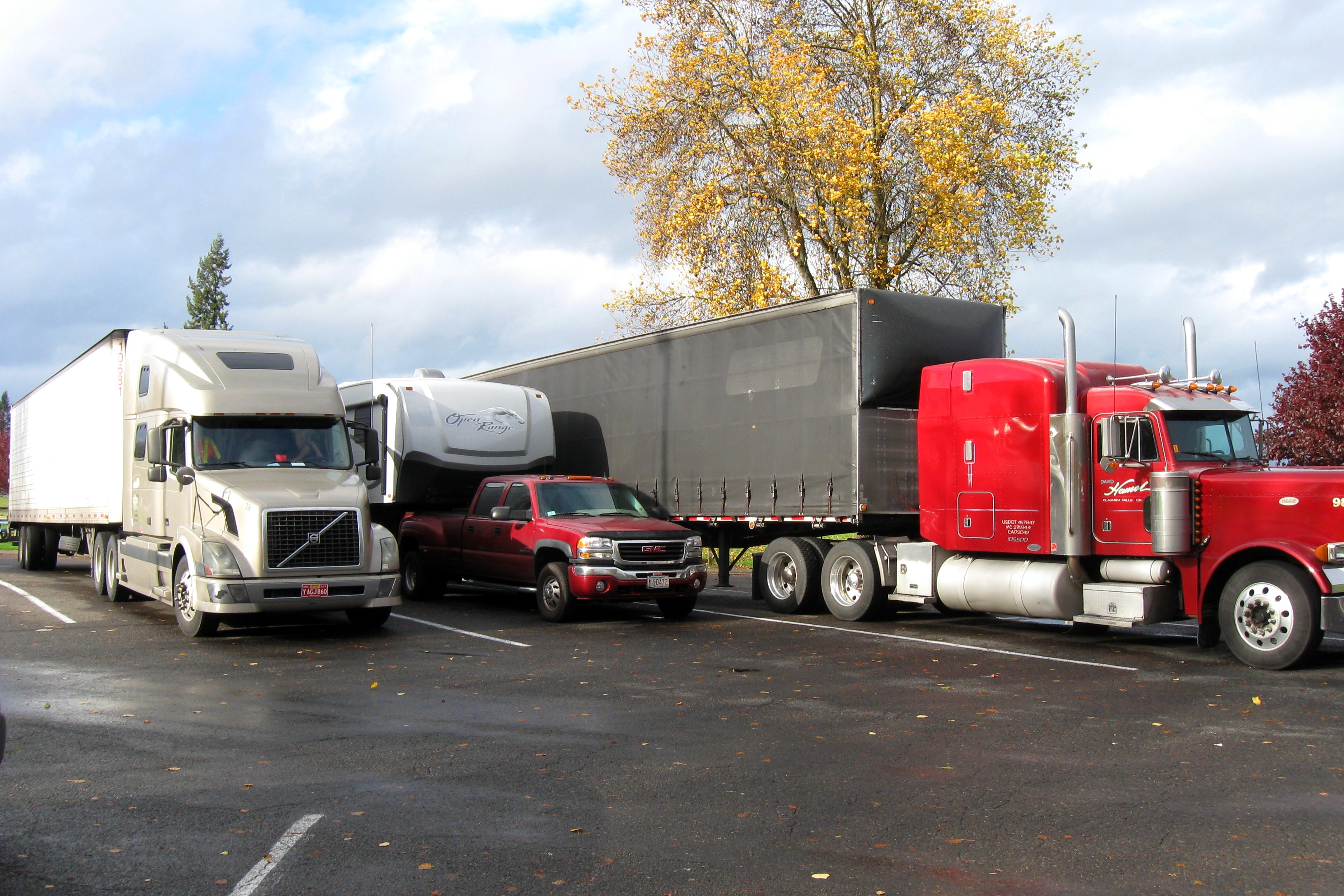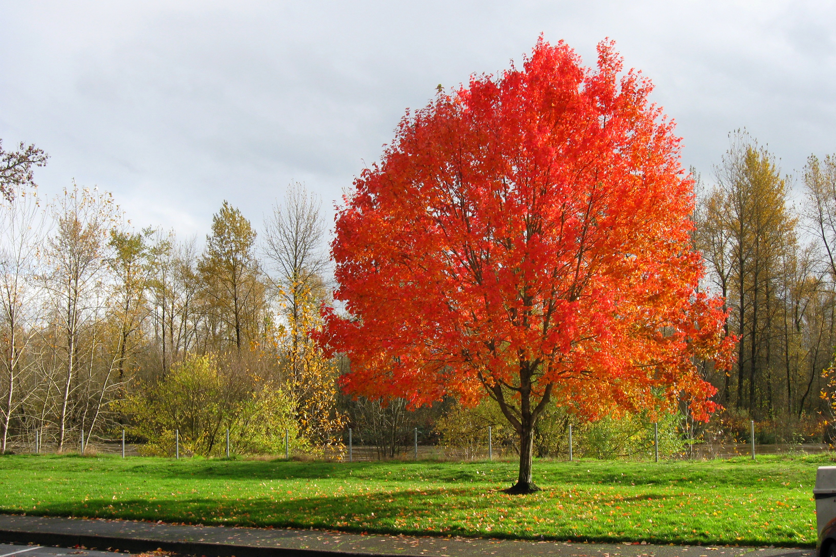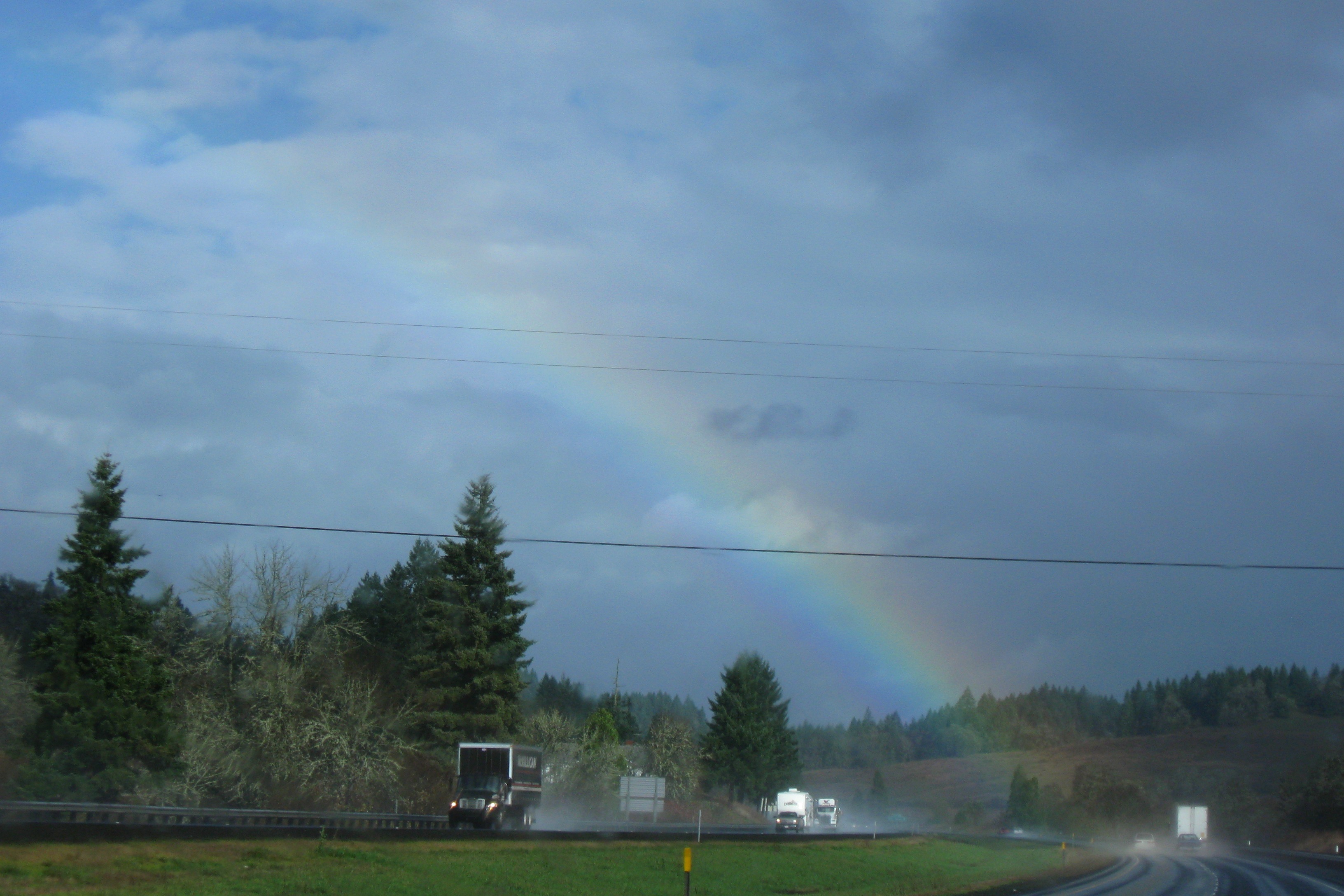 We stopped for lunch at a riverside rest area just south of Salem. There was a beautiful tree there which displayed well in one of the rare sunny breaks. We also got a rainbow.