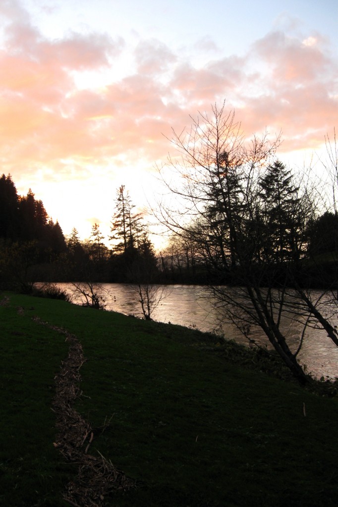 We arrived at our destination – the Wilson River RV Park – at dusk. The river was still high but had apparently dropped six feet from Monday’s peak. Debris on the shoreline showed that the water level topped out just a few feet below the RV pads.