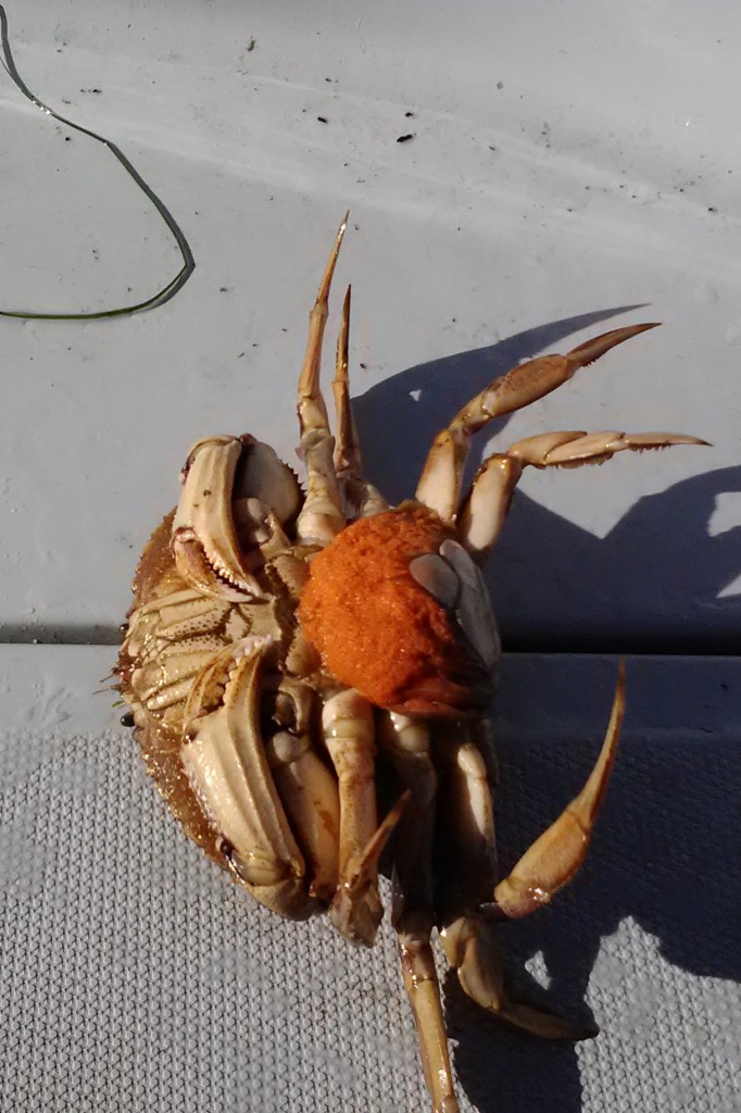 One of our throw-backs was a pregnant female, about to unleash a million eggs into the waters of Netarts Bay. Apparently it is pretty rare to find a female in this condition. My sister Lois, who has crabbed many more times than I have, said she has never seen one.