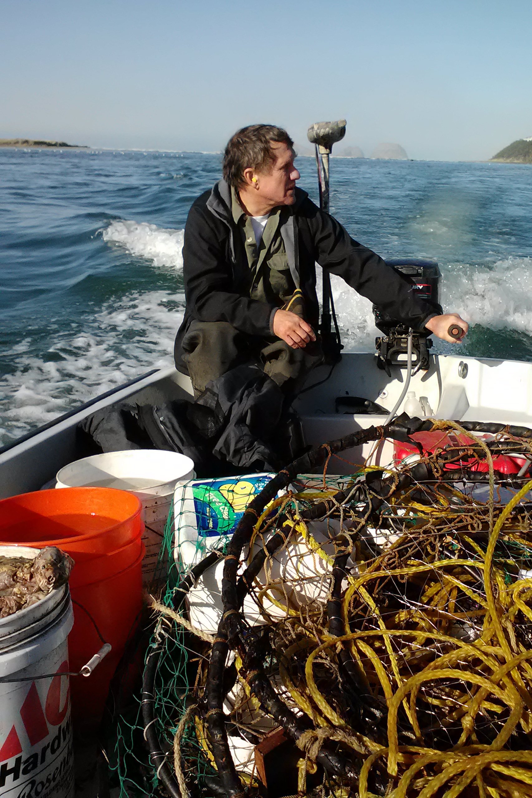 Kim steered the boat while Chris and I took turns setting and retrieving the rings. Kim is an avid environmentalist and was happy every time the ring came up empty. But she was a good sport and resisted the urge to Free Captain Krabs.