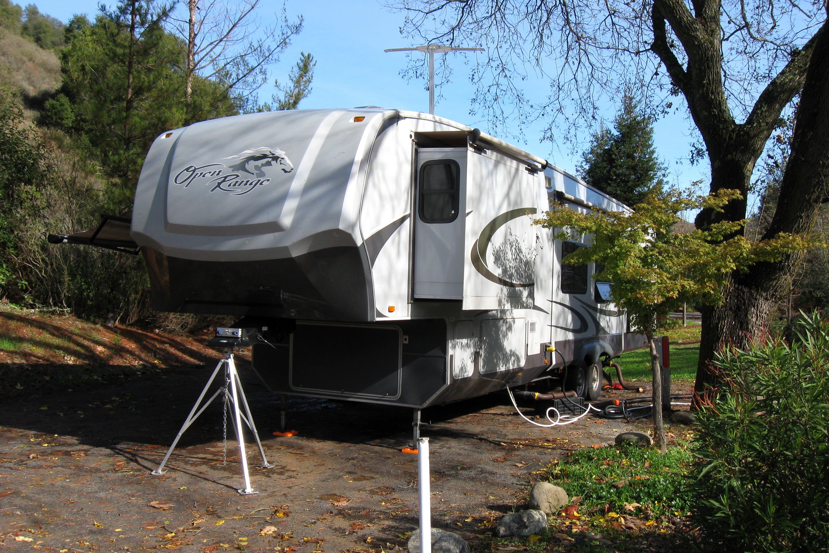 The declaration of the “penultimate” hop turned out to be premature. The park where we spent Sunday and Monday nights – the Uvas Pines RV Park – was unpleasant enough that we decided to return to a different RV park after getting the slide cables fixed. However, even that plan had to be changed as the RV shop was unable to get the work done on Tuesday (something about the frayed cable getting tangled in the pulleys). So we spent the night at Hotel Elan in San Jose. The dogs love it – they can sleep on the king-size bed – but I spent the night thinking about the “labor rate: $120/hr” sign on the wall of the shop and calculating just how much these broken cables were going to cost us.