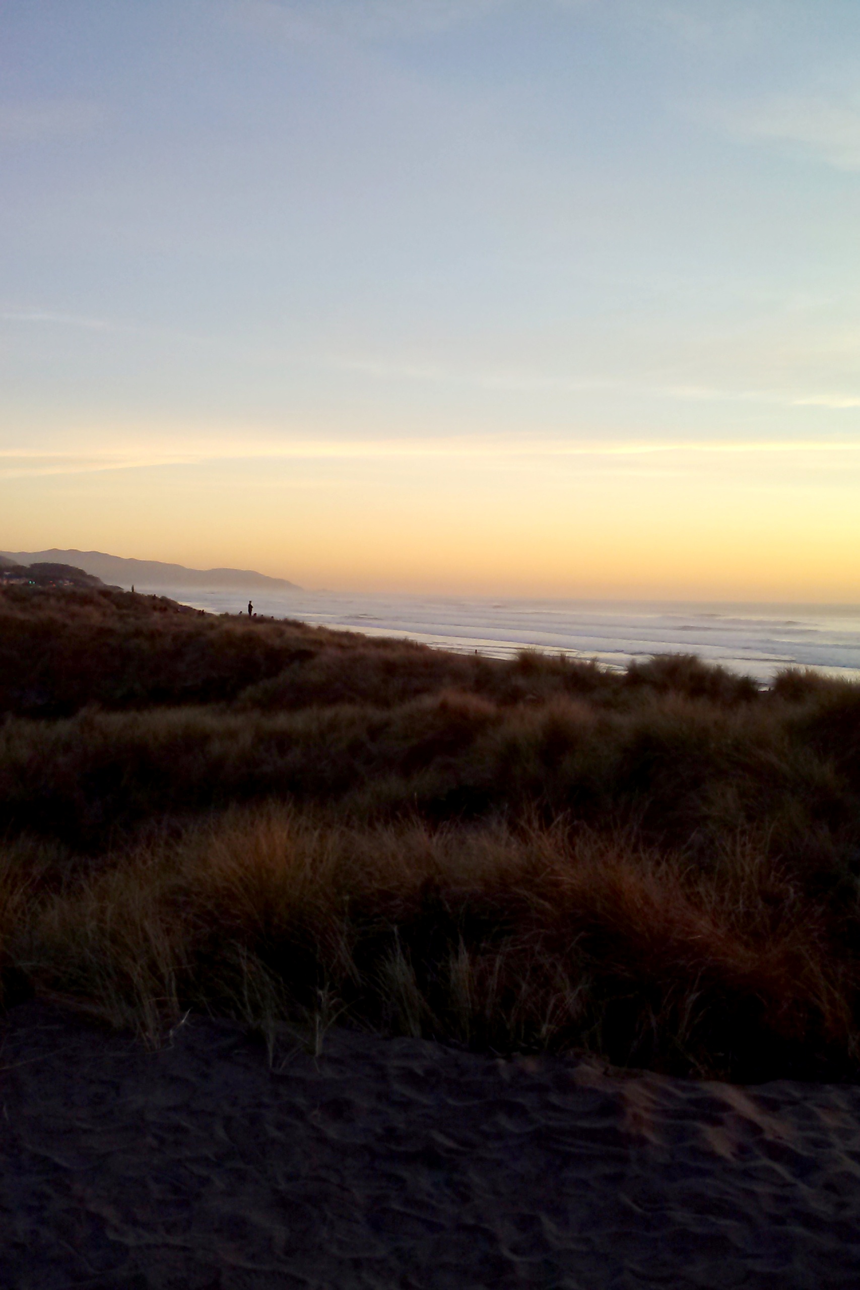 I drove through Half Moon Bay and into Pacifica, along some very scary cliff roads that will soon be replaced by a tunnel. I tried to find the RV park in Pacifica that was one of the first to grab my attention when I started looking for places to stay (rejected due to expenses and climate concerns), but was unsuccessful. I then broke off of CA 1 and drove north on Sunset Boulevard into San Francisco’s “Sunset District”. I got there just in time to see the sunset and was struck by how many residents made the short walk to the beach to view it. Clearly, people live in the Sunset District because of the sunsets. Big surprise.