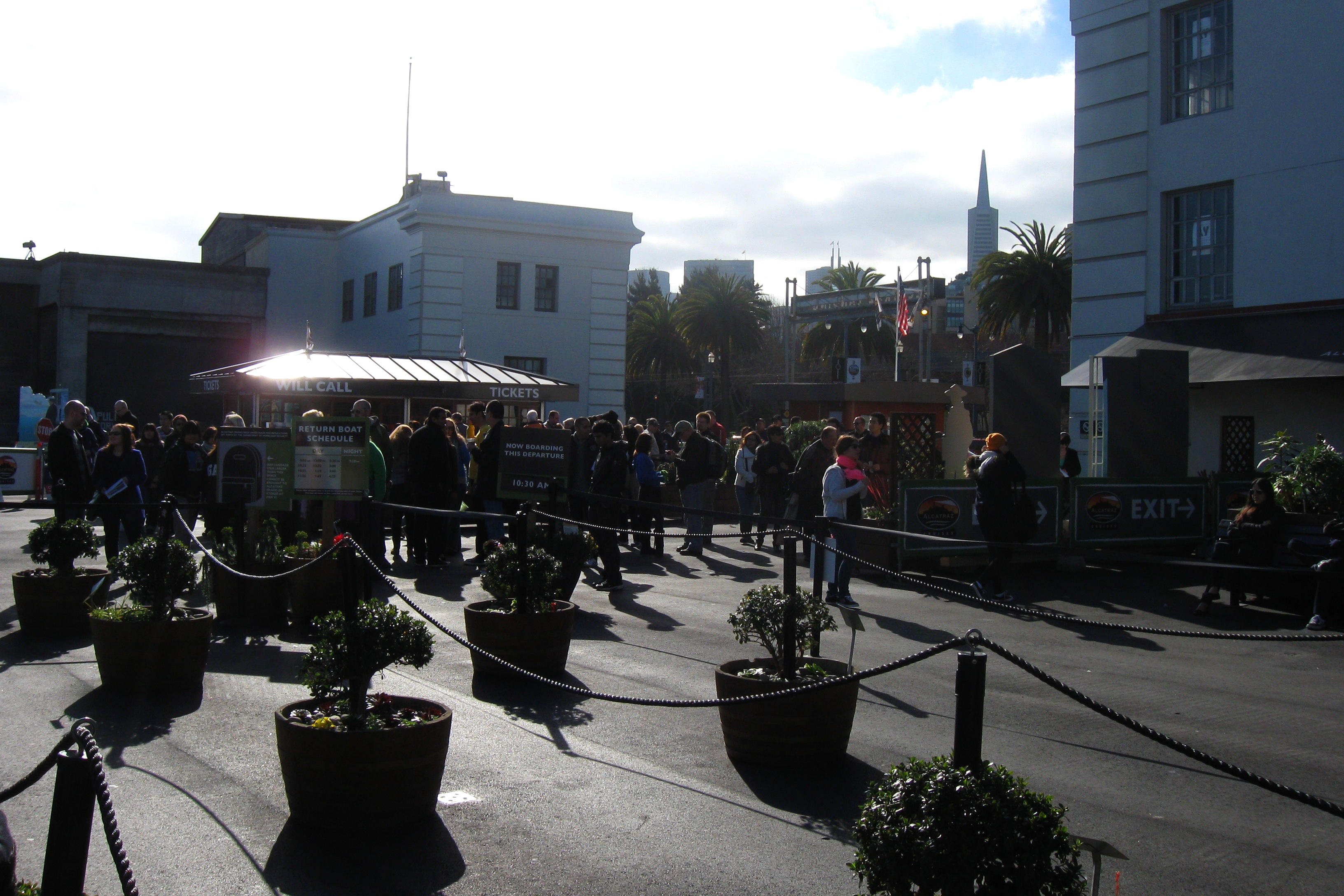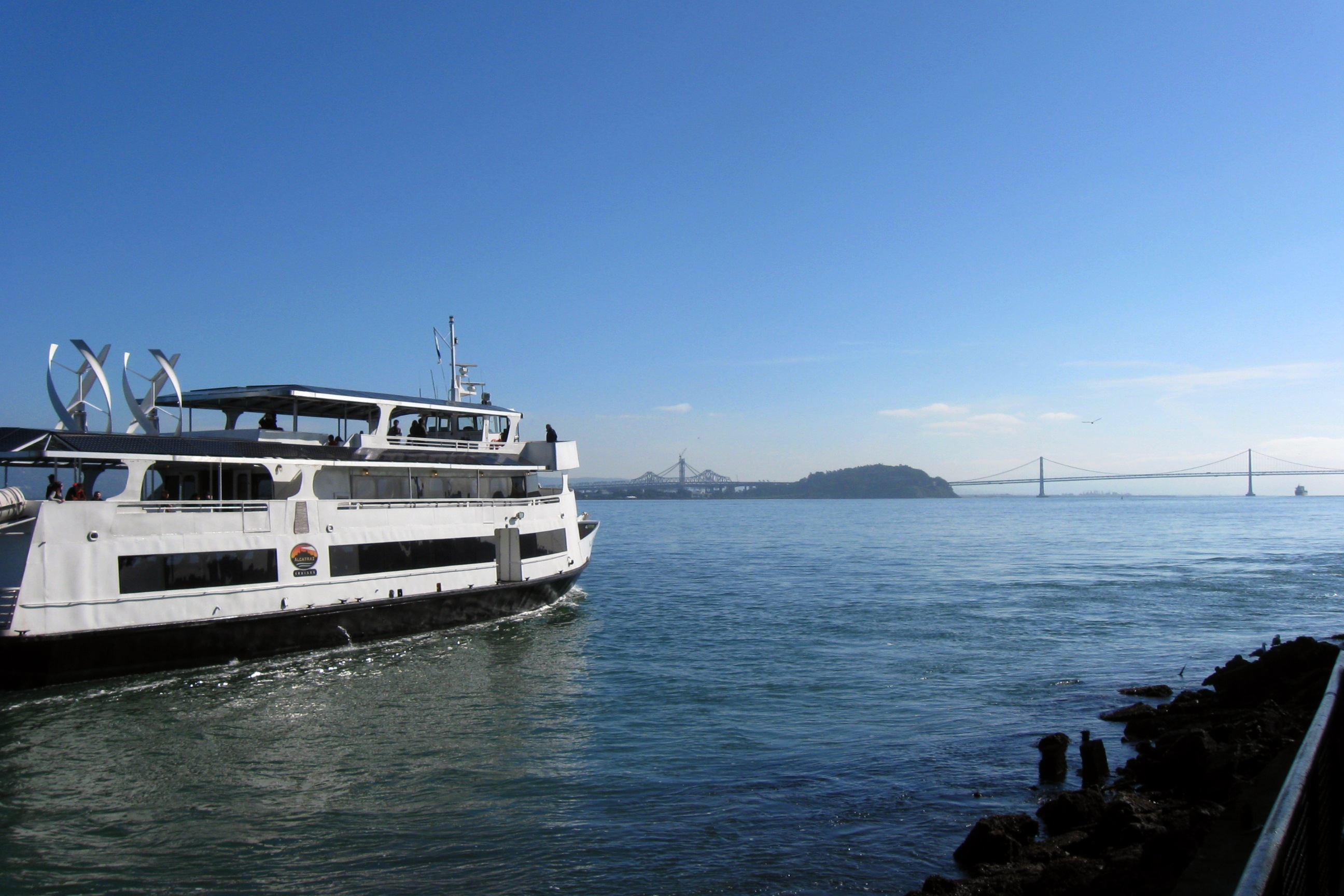 The drive from Morgan Hill to Pier 33 on the Embarcadero takes about 70 minutes. We didn’t get off until 8:53 and our ferry left at 10:30, so we were cutting it a little close. Still, not to worry, because there is a parking lot directly across from the pier. We got there, as expected, a few minutes after 10. I queued up to buy a ticket from the self-service machine – the only machine in the lot. And it jammed. After wasting a few minutes seeing if it could be fixed, I gave up, hustled Jett back into the rental car and drove off, madly searching for another parking lot. We found one about two blocks away, parked, hustled back to the pier and queued up to get our prepaid tickets. The line was short, thankfully, because the ferry was already boarding when I got to the window. We made it, but with less than 5 minutes to spare.