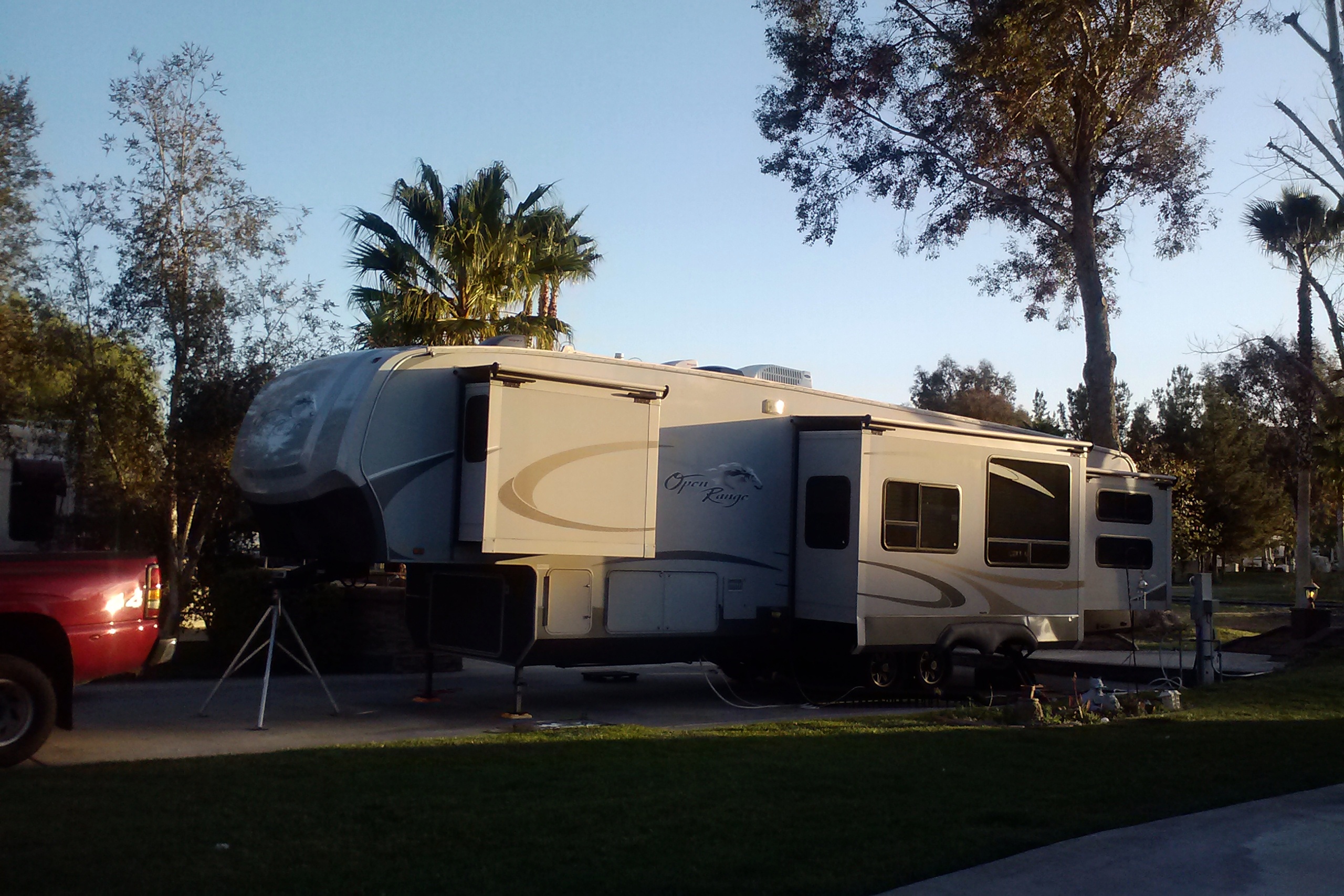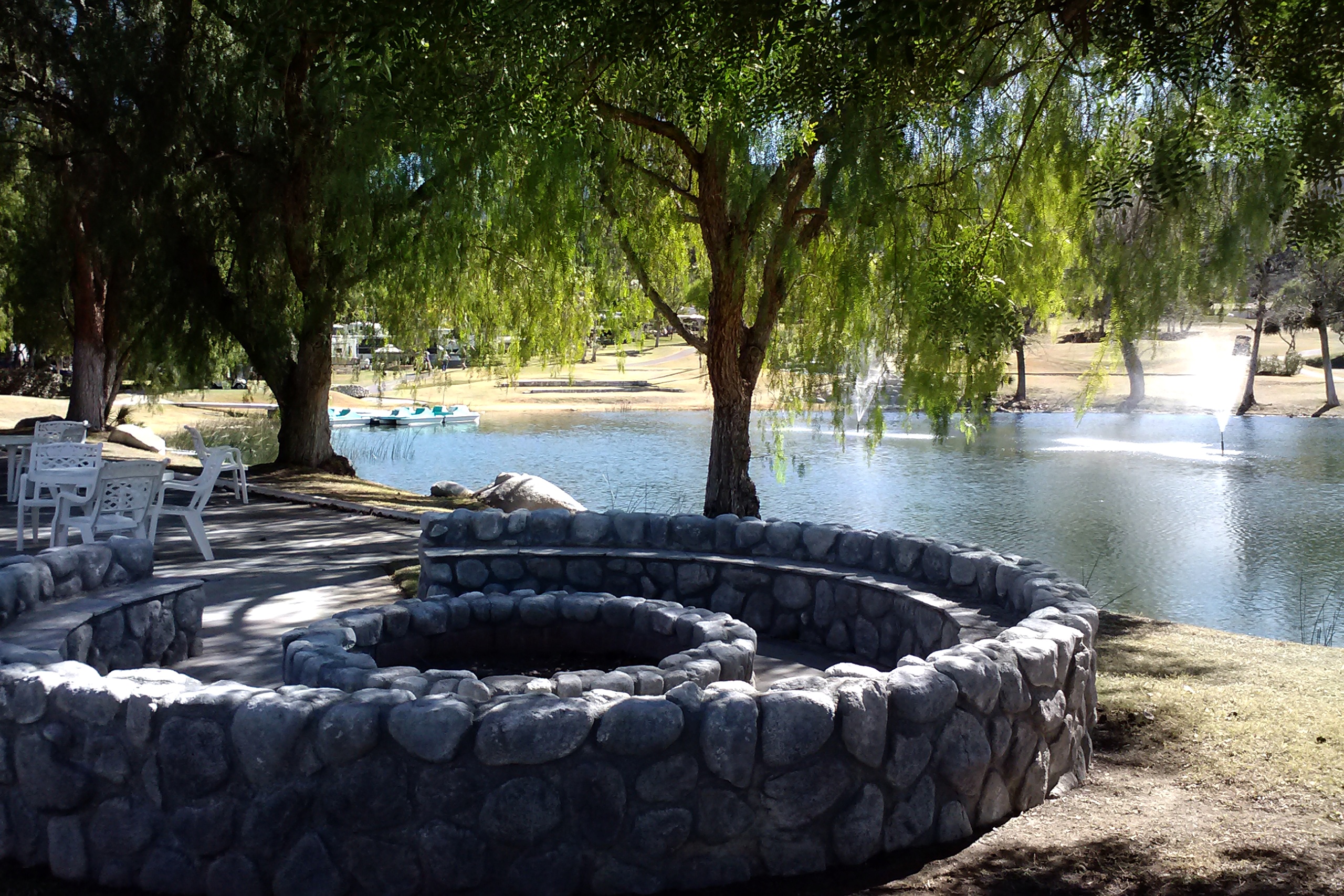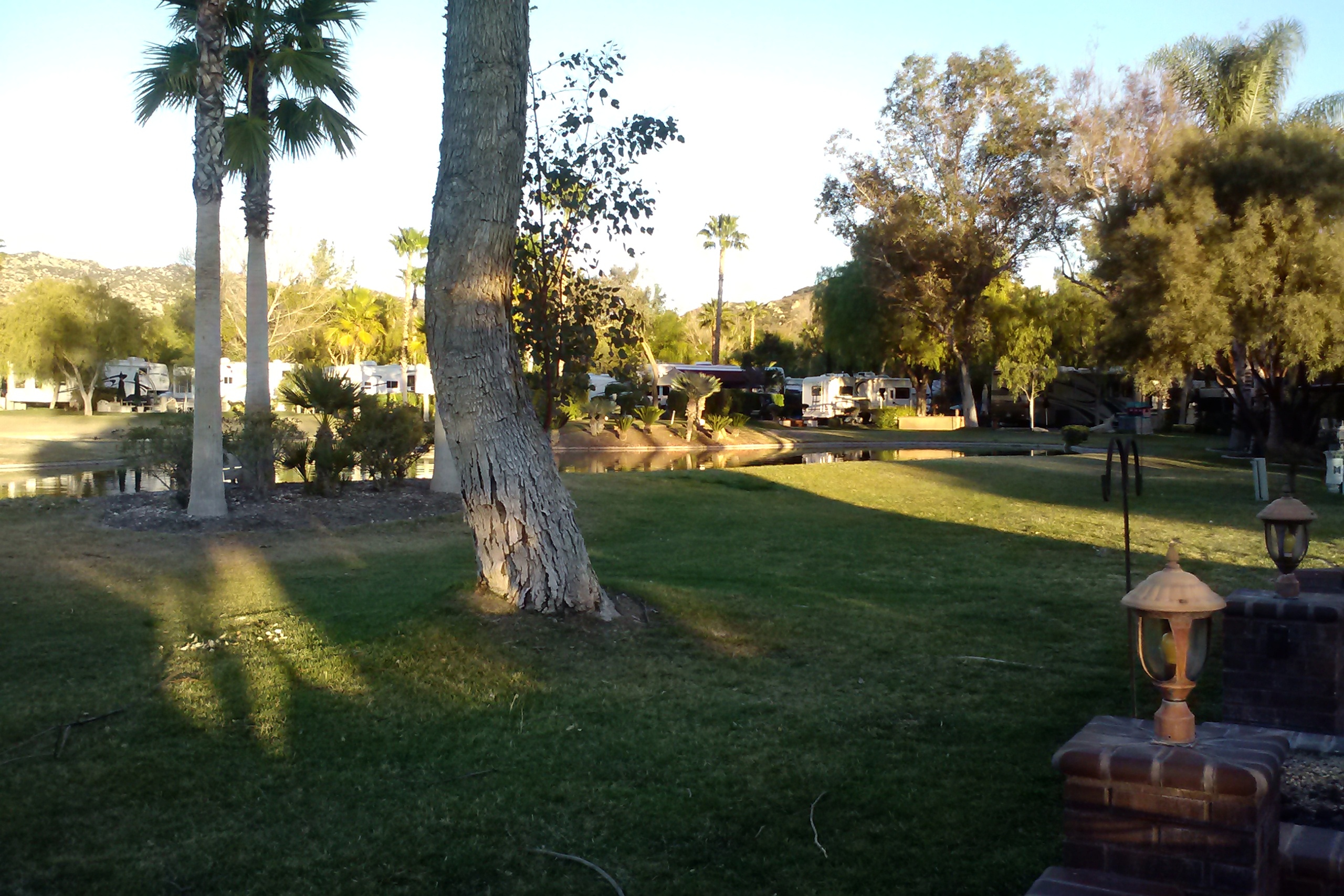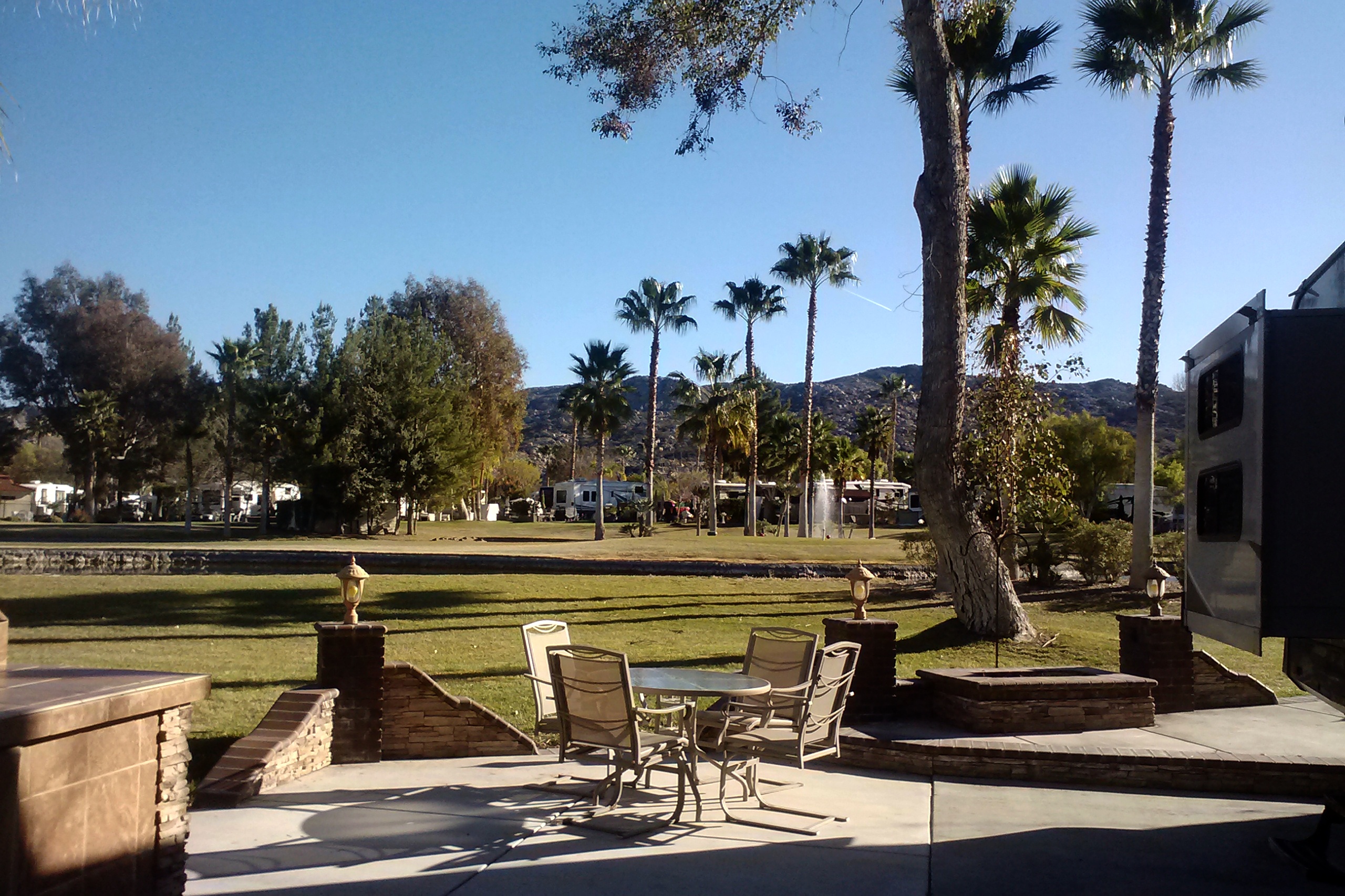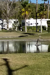 What do we like about it? Start with the site we are renting. Compared to our previous site, in San Jose, it is positively luxurious. It has an outdoor kitchen, with a grill, a sink and a refrigerator, and a patio furniture set. It has beautiful landscaping, including some palm trees. It abuts the third hole, with fountains in the pond. The pond is a haven for waterfowl and the hole is a constant source of amusement as we watch duffers even less skilled than I navigate the hazards of the hole. There is enough pavement to accommodate not only Patience and the truck but also the rental car and the golf cart.