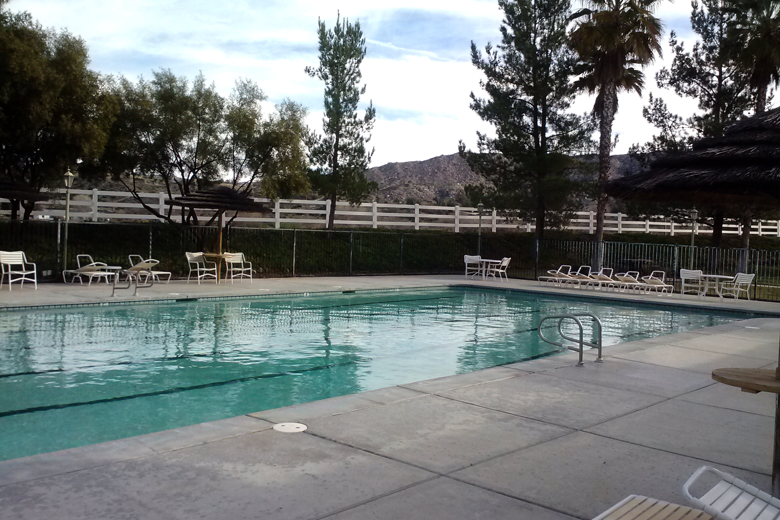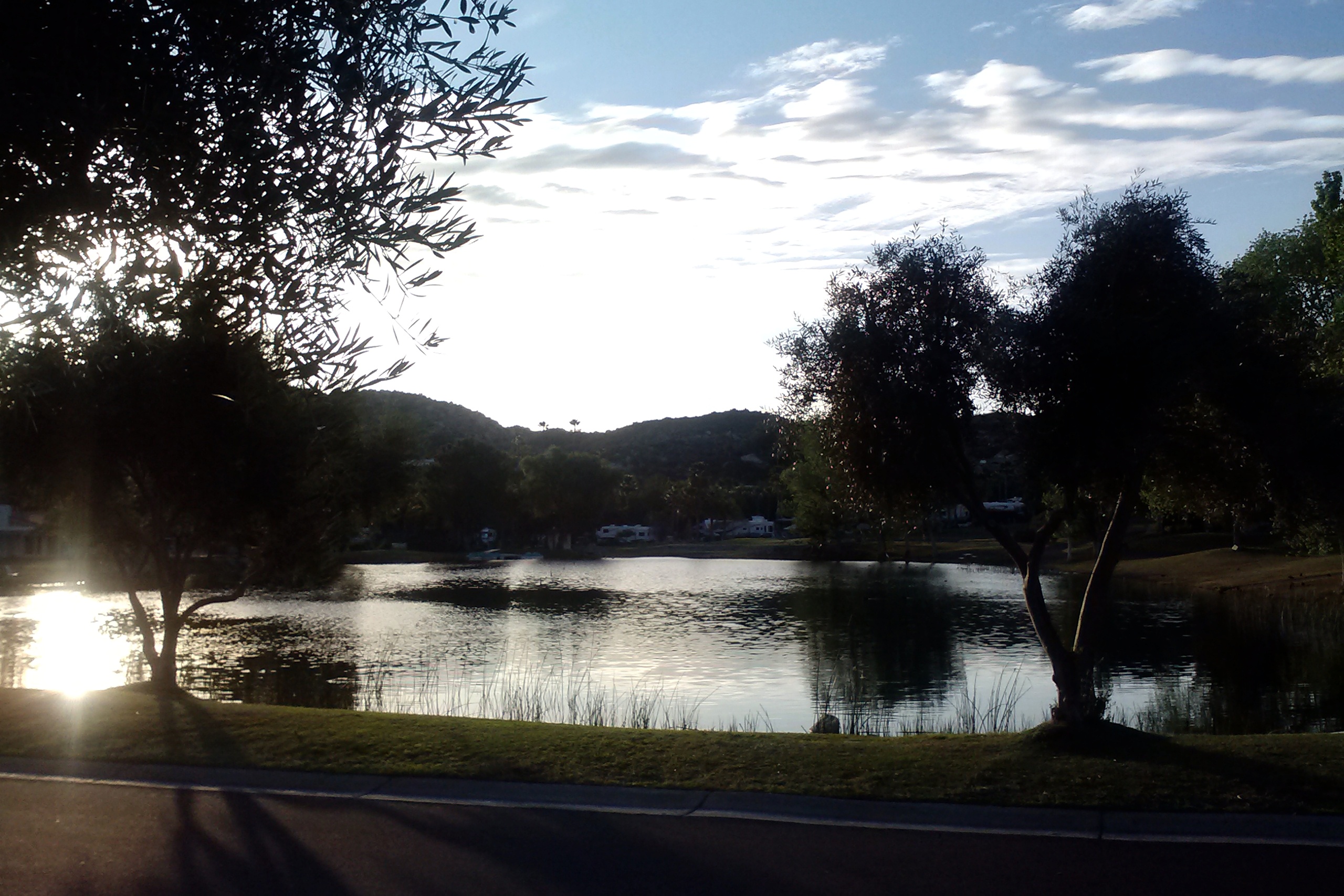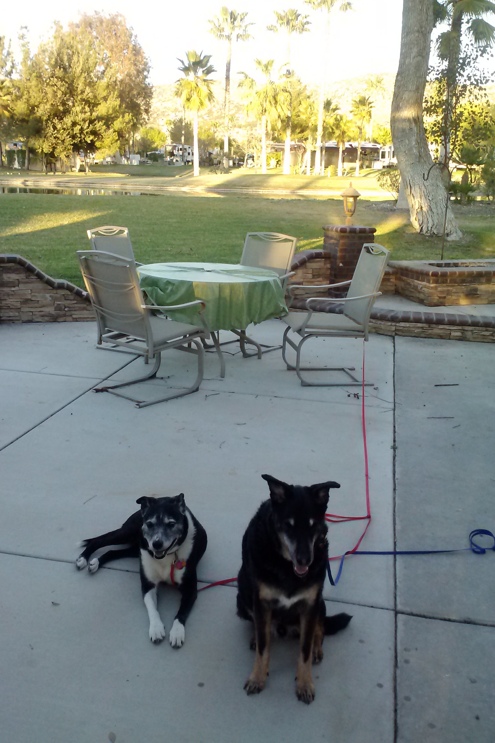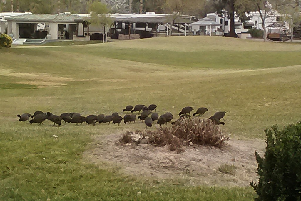The park has 5 pools and 5 laundry rooms. Two clubhouses (one with the largest paperback swap library that we have seen anywhere). Tennis courts. A dog park (where our pups have made some friends). A market and a cafe with a patio. Lots of open space for dog walks and birds everywhere, including hummingbirds, hawks, various ducks, egrets and cranes and the omnipresent coots (a.k.a. mudhens, according to some residents). I have seen a roadrunner and a coyote and I am told that a bobcat was sighted nearby recently. Rattlesnakes in the surrounding desert. It is a good place to learn about and appreciate wildlife.