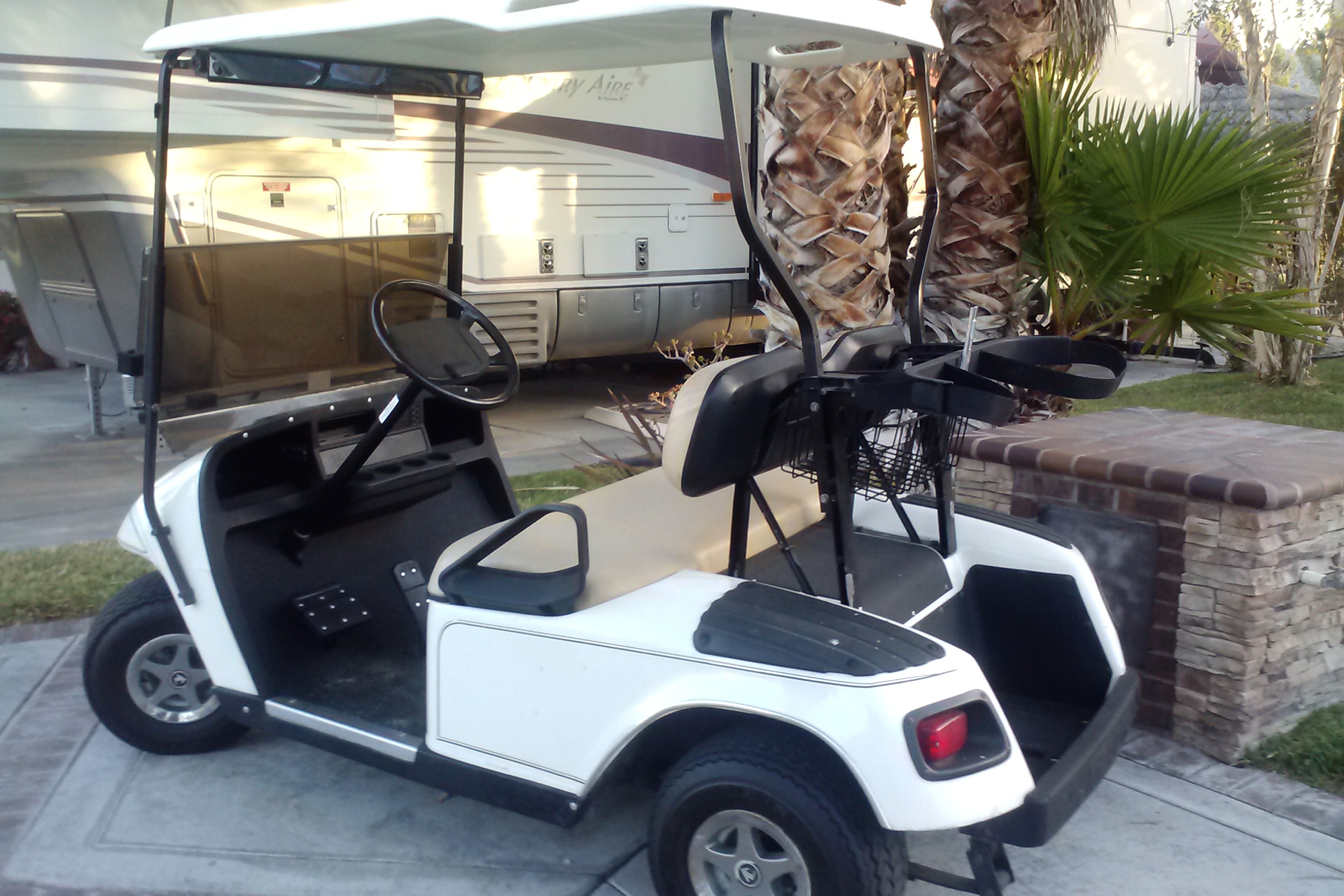 As is fitting for our location, we bought a golf cart. This isn’t just for me to use while golfing (though it works great for that purpose) – it is also our main form of transportation within the park. If we need to run to the store or fill a propane tank, we take the cart (or, to be snooty about it, the “golf car”). We bought it used for about $1,600 and hope to sell it for about $1,300 when we leave. That will keep the cost down to about $100 per month, well below the ridiculous $300 per month that it would have cost to rent one.