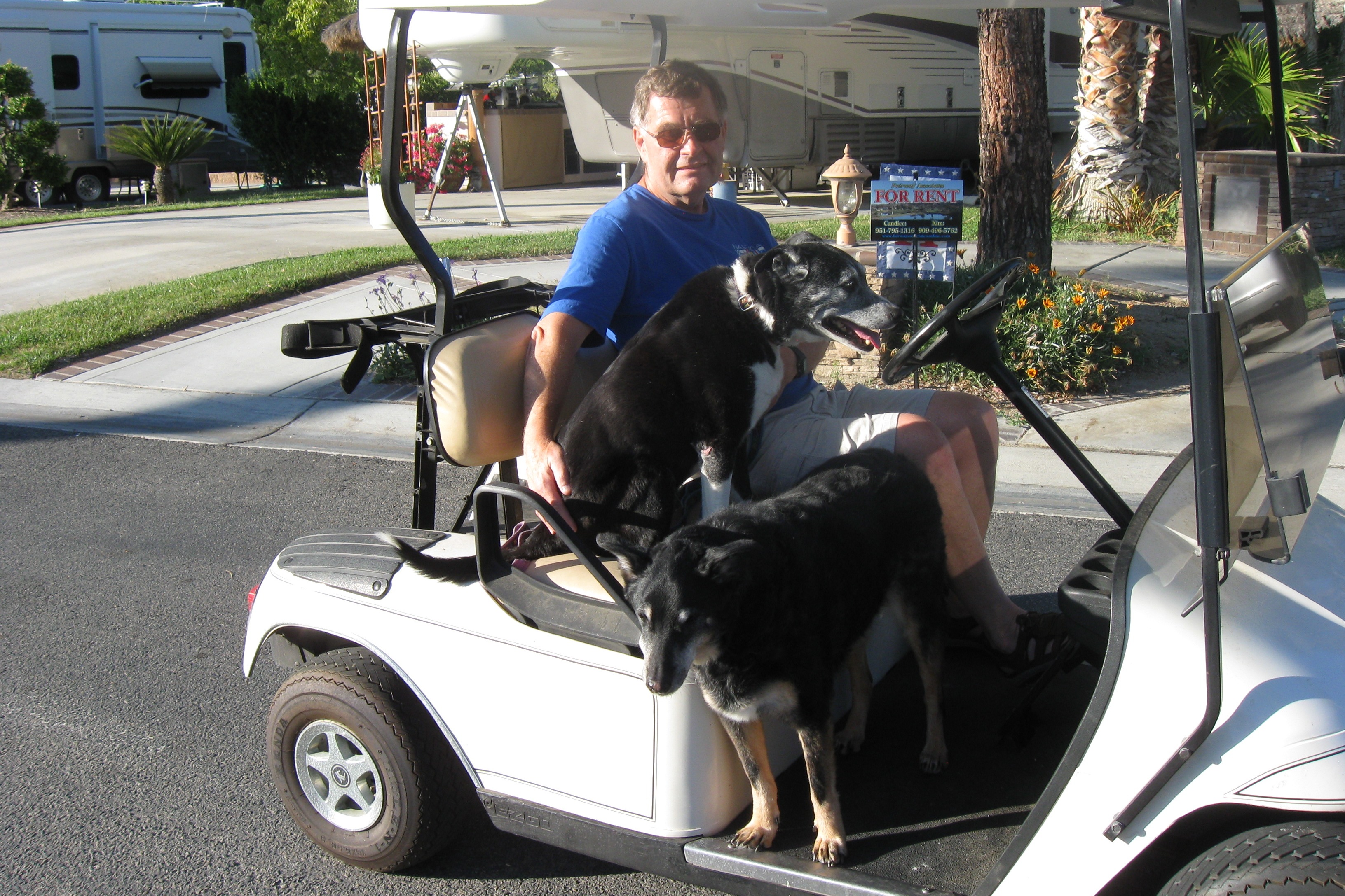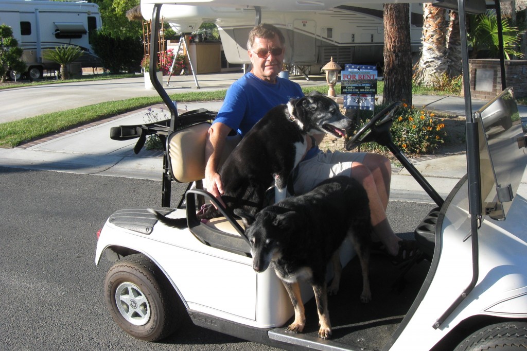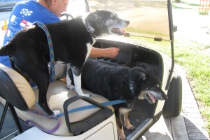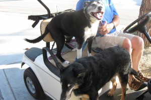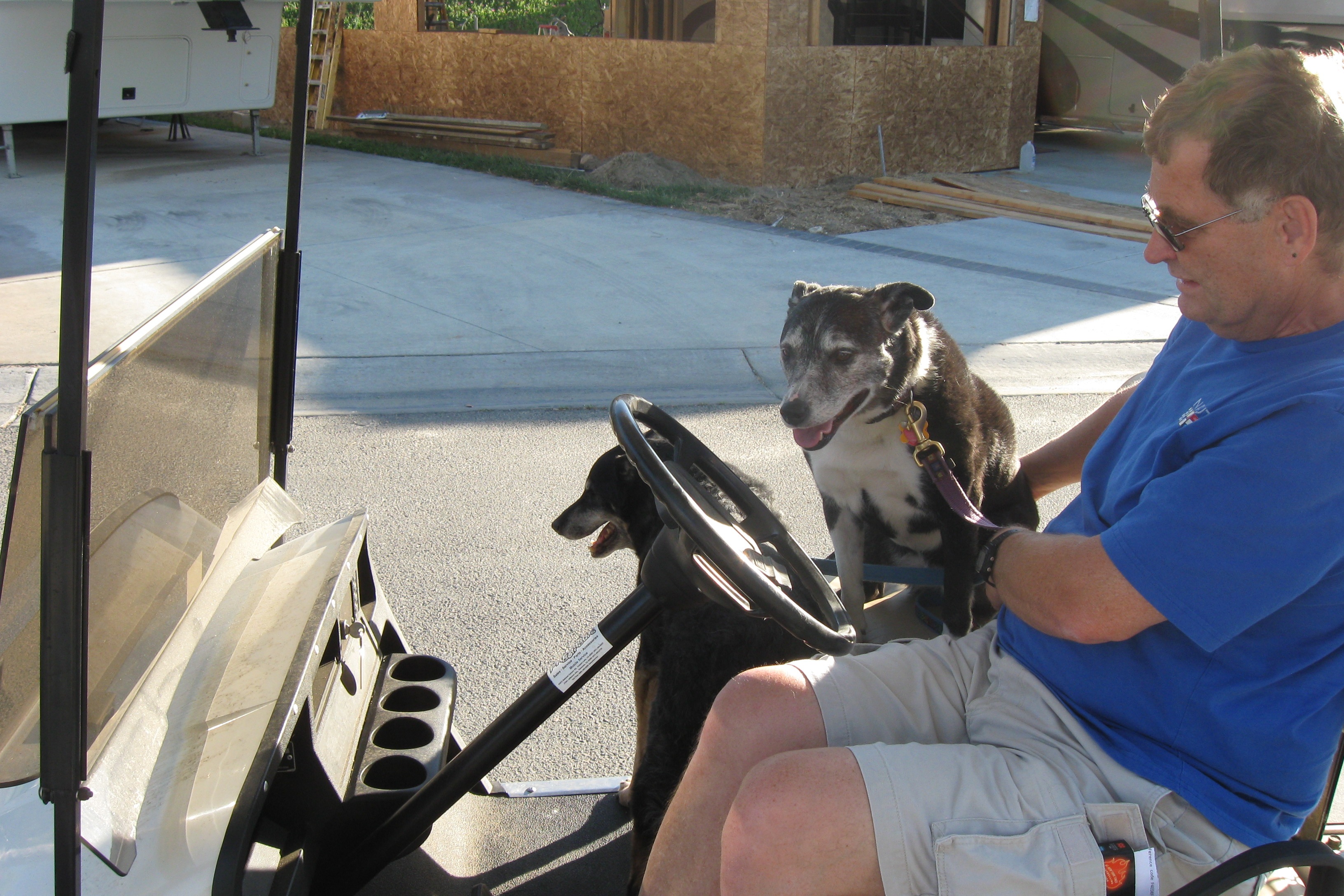 Well, two days after posting the ad I got an offer for $1,300 and I did, indeed, jump at it. I negotiated a delayed delivery so that I could get in a couple of final rounds of golf. But on May 20 – 10 days ago – we delivered it into the hands of the new owner. I really enjoyed having a golf cart and was sad to see it go. The dogs, however, were devastated. They LOVED the thing. Each evening they would eagerly climb aboard – Grace on the seat, Cha-Cha standing on the floor – and we would head down to the dog park to socialize.