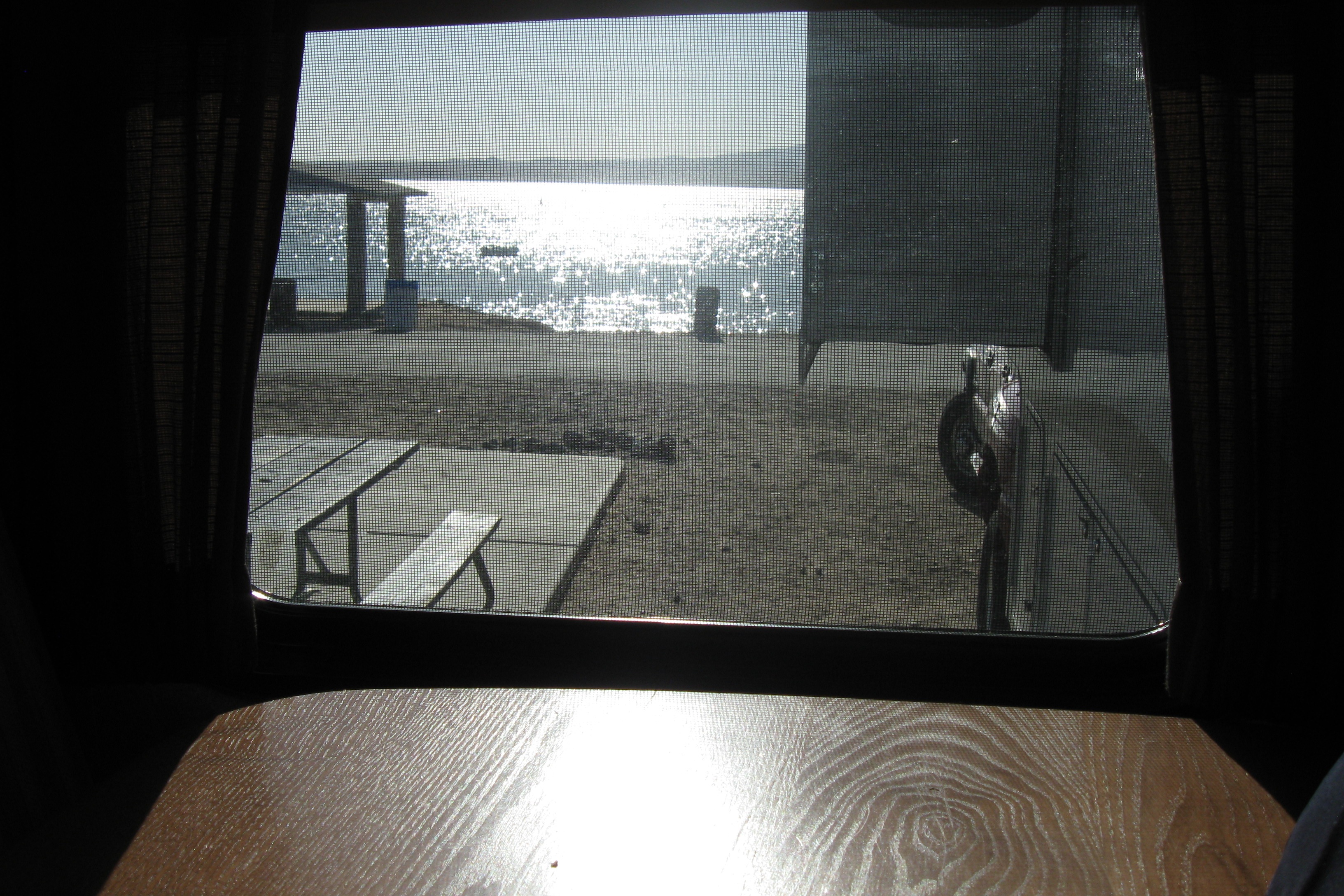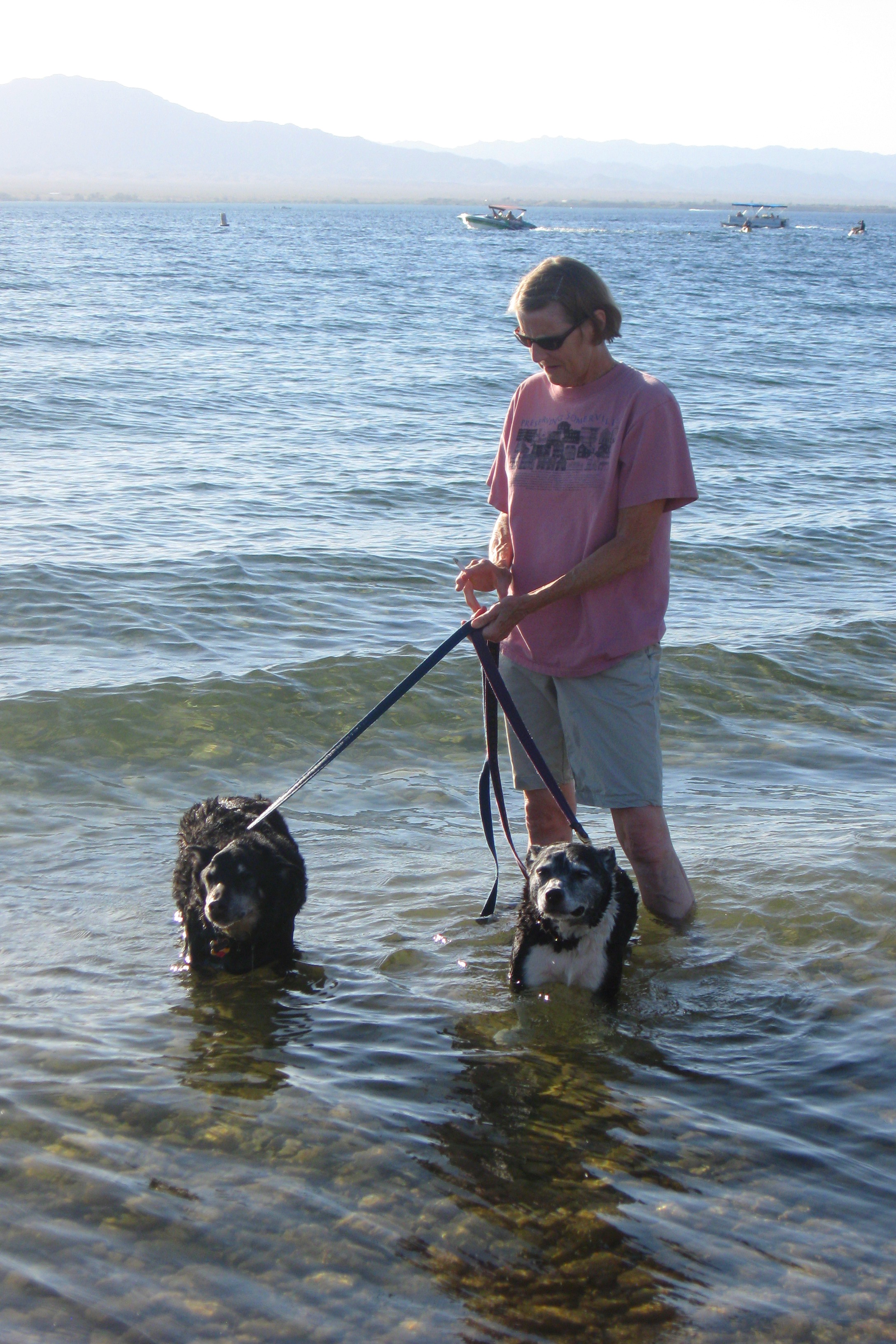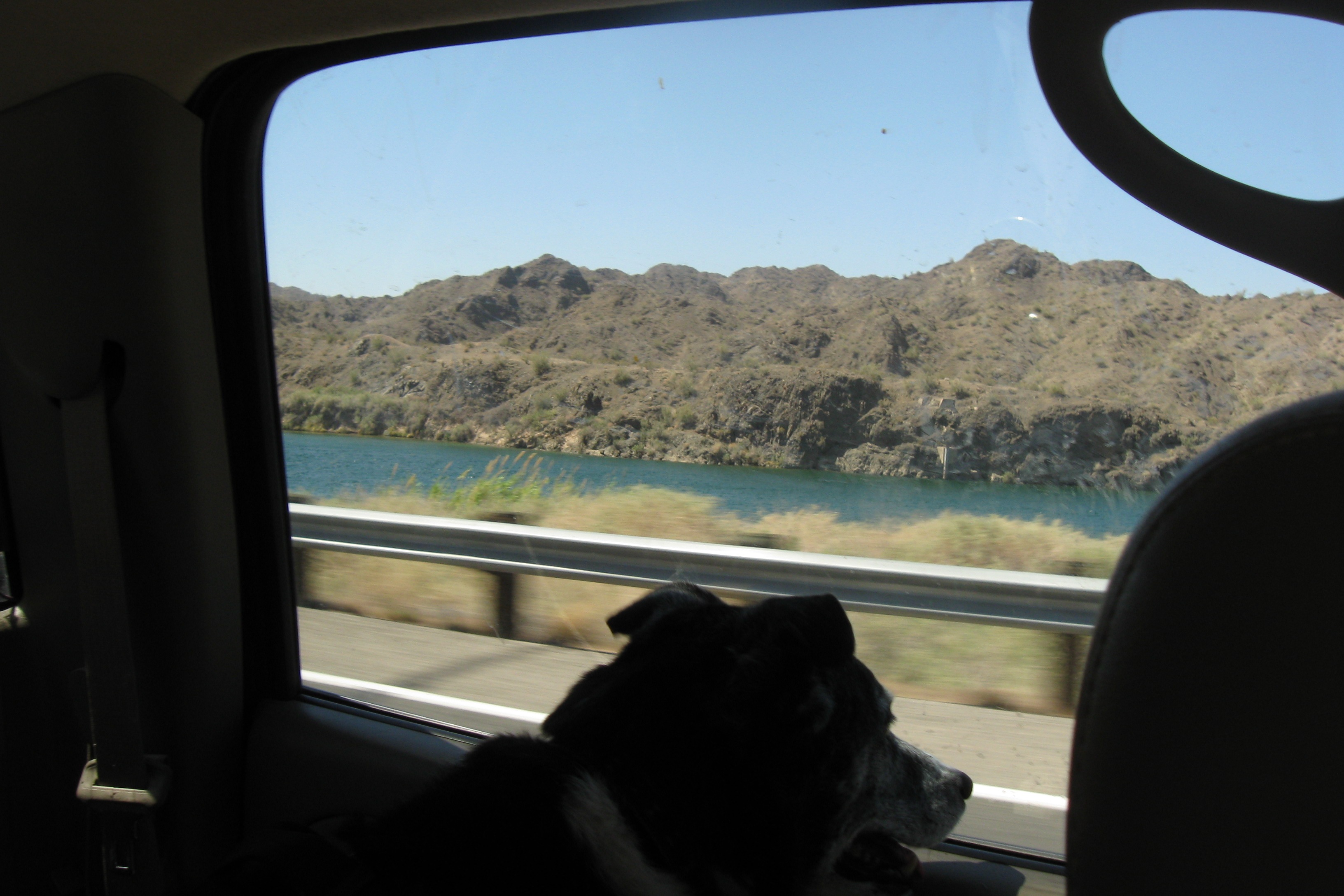 At Crazy Horse we got Patience deployed in record time on a beachside pull-through, got the A/C cranking (which is to say, only slightly better than fans – the A/C in the RV is not made for 115-degree temps). We rested for a couple of hours (but didn’t nap – too hot), then got into our suits and jumped into Lake Havasu, just a few steps away. Ahhh… relief! I think I saw steam rising. The dogs enjoyed it, too.