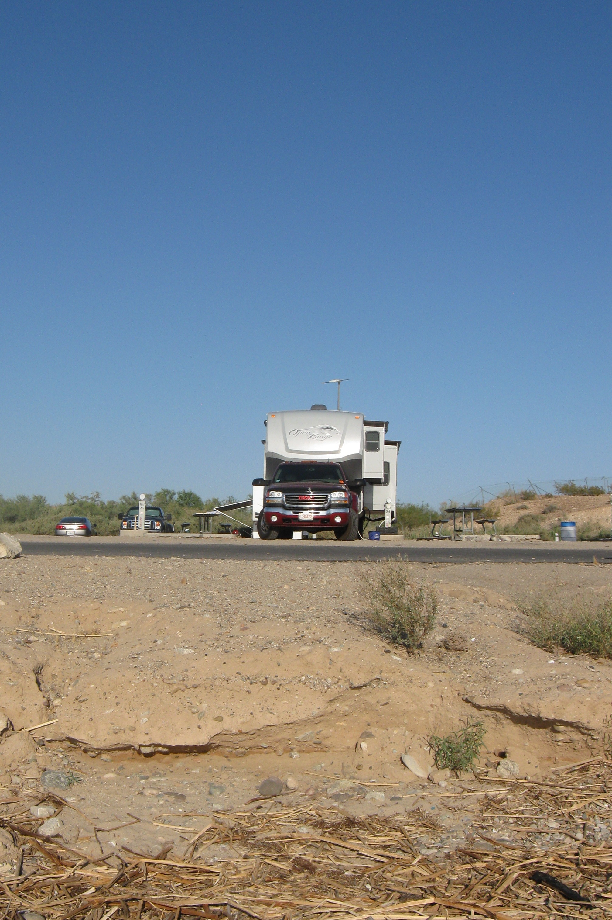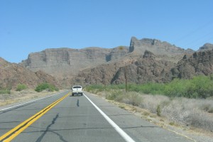 The first day of this two-day hop was 279 miles, of which about 150 were through desert that was excessively hot, even by desert standards. I was pretty worried about how the truck would perform as we have never taxed it this way. The most difficult stretch last fall on the GTW was the long, uphill climb from Phoenix to Flagstaff and we did that in temps in the 70s. By contrast, once we hit Palm Springs – about 100 miles into the first day’s trip – the temperature was above 100 the rest of the way to Lake Havasu City. The worst part was the uphill climb out of the Coachella Valley, during which the transmission temperature hovered around 250 degrees, just 15 degrees below the red line. But it made it up the hill, cooled down once it hit the flats and in general performed like a champ.