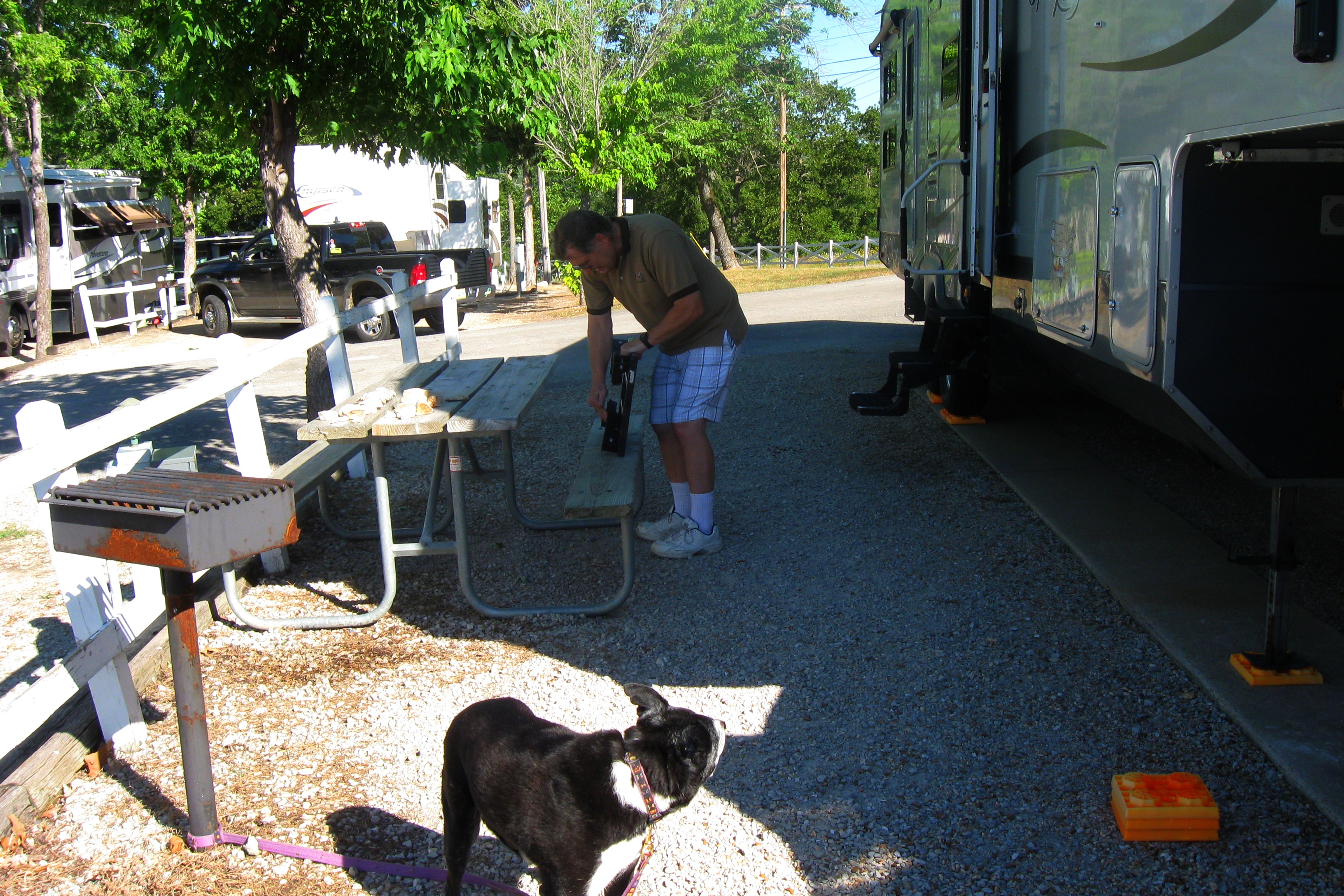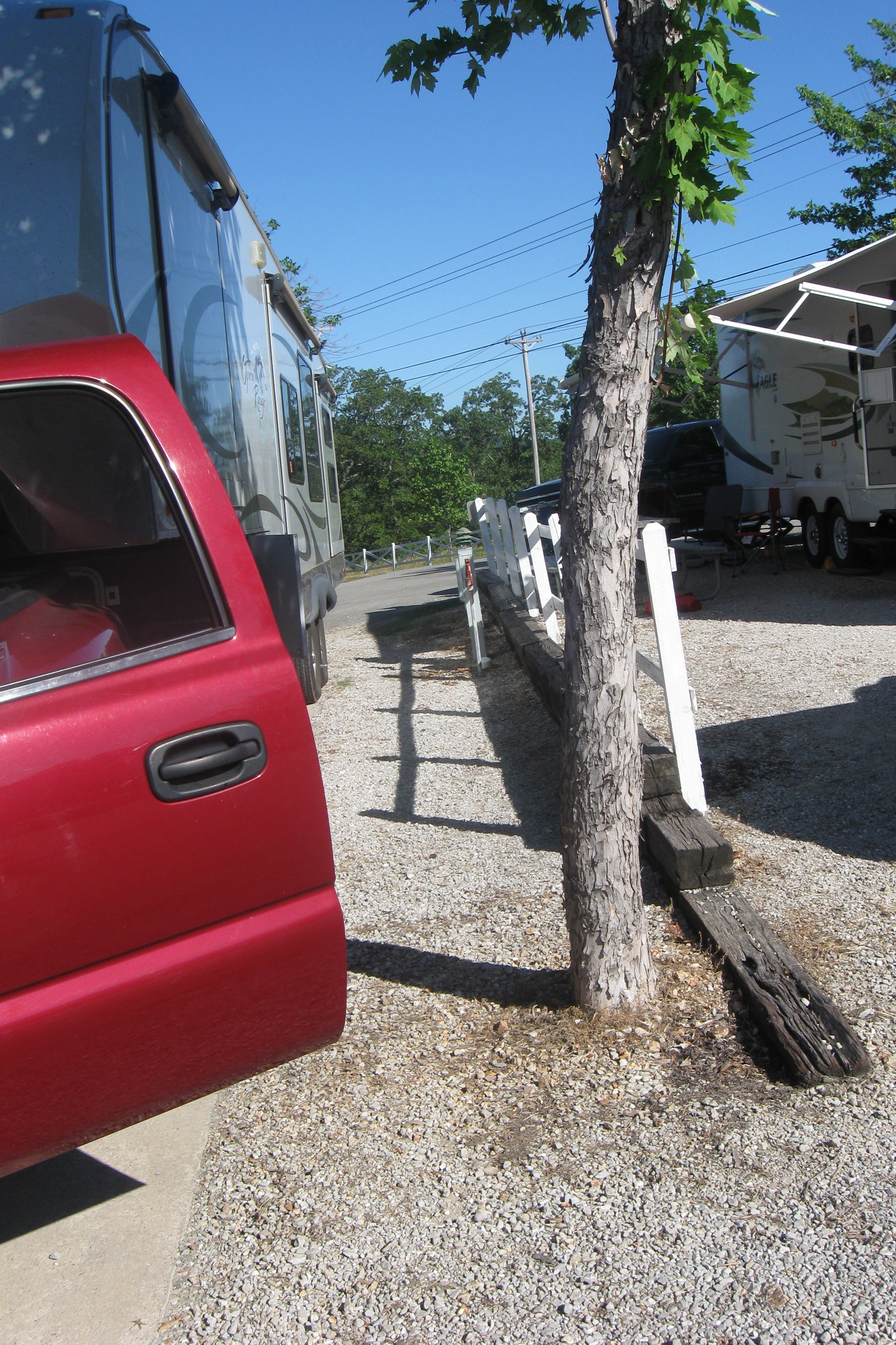 This was a 1-day hop that compensated for the previous 3-day hop. Both I-44 from Oklahoma City to Tulsa and US 412 from Tulsa into Arkansas were very hilly – lots of up-and-downs, the result being very poor mileage. Most of the route was 4 lanes or better, but the section of US 412 from Springdale to the junction with US 65 was 2-lane road, with lots of curves. Jett hated it and I wasn’t a big fan, either. The last 2 miles to the Branson KOA were scary – narrow, winding roads with low-hanging trees. At one point was had to zig-zag a short stretch on what looked like a cart path. High anxiety.
