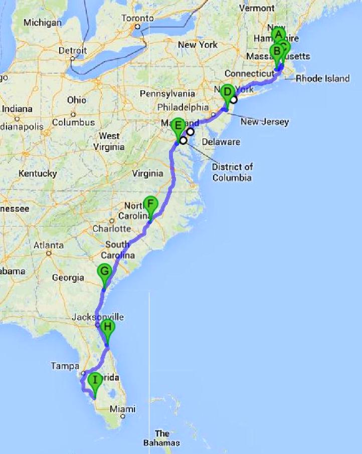 Total distance: 1,625 miles over 8 days of travel for just about 200 miles per day on average. But the average is skewed by those first 2 days to Foxboro; the other 6 days will cover over 1,500 miles or over 250 miles per day. The longest hop will be from Alexandria, VA, to Wade, NC: 288 miles.