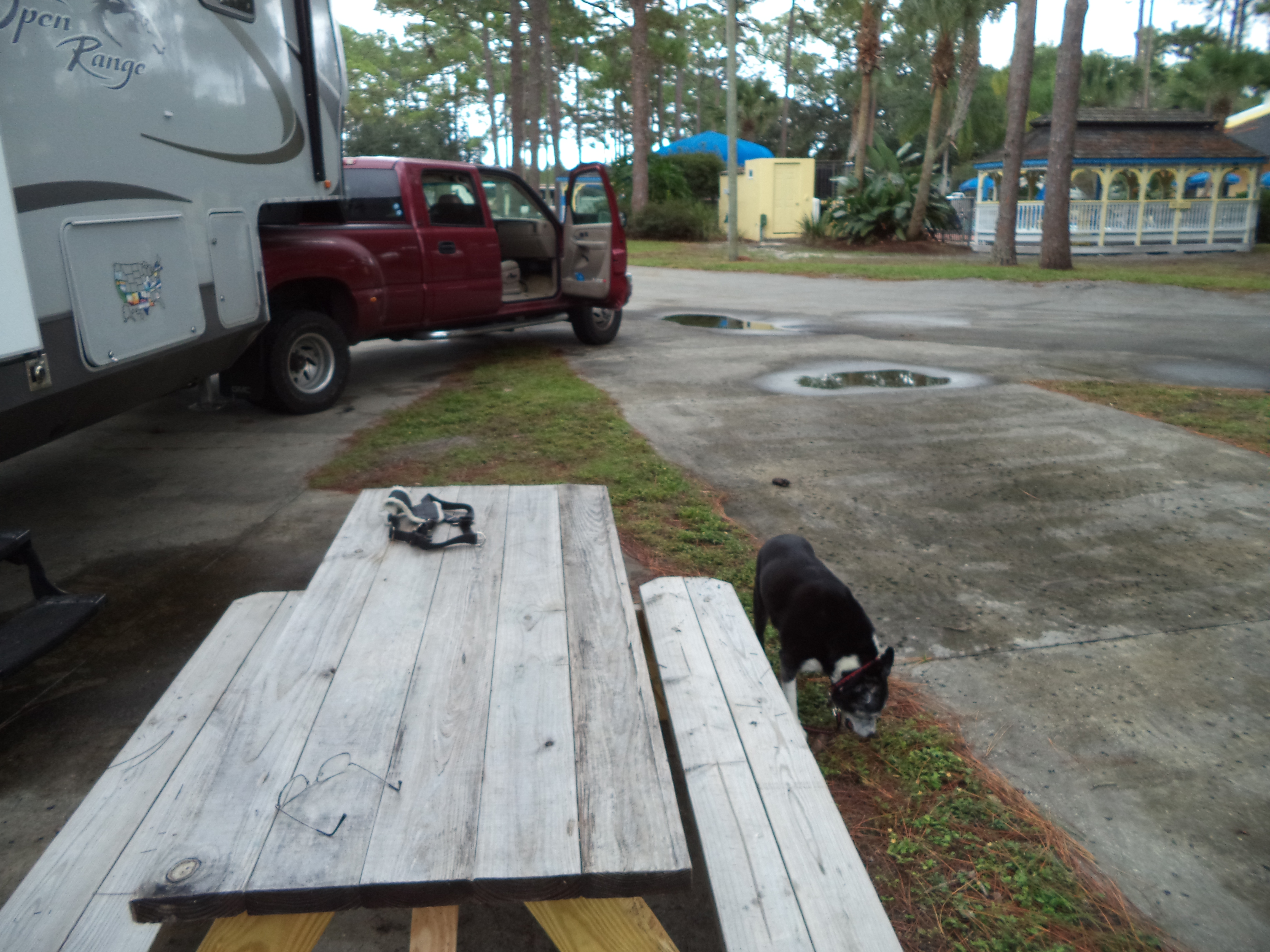 The most interesting part of the trip was lunch. We pulled into a Publix parking lot and Jett went in to get us some sandwiches. I had to position the rig so it wouldn’t block anybody and try to figure out how to exit – not a simple matter as it turned out the the way out that I expected to use was actually an entrance. I finally opted for a U-turn in the lot, then exit the way we came in. But I had to back up a bit to get enough room for the turn, which meant that Jett had to stand behind the rig and block traffic – something that she hates. But we made it.