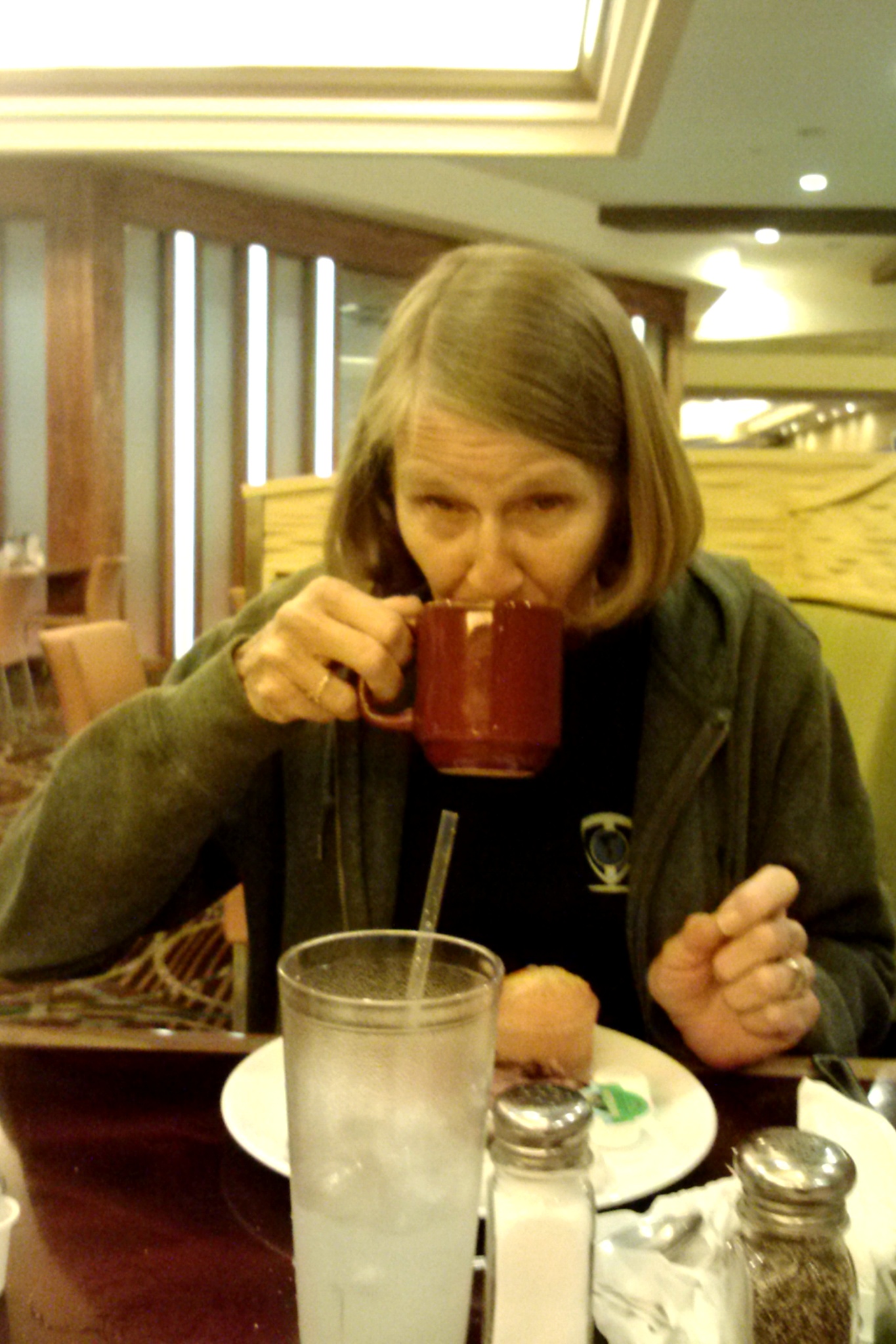 What else is prominent in Biloxi besides the vacant beachfront? Casinos. Nine of them in the city limits and several more nearby. It may have more casinos, per capita, than Vegas. We went to two: the Grand Biloxi (soon to become Harrah’s Gulf Coast Casino) and Treasure Bay. We had the BOGO buffet on Monday night at the Grand Biloxi – two all-you-can-eat meals for $20! The photo on the right is one of the rarest photos in existence: a picture of Jett drinking instant coffee. In the 17 years we have been together, I have never witnessed instant coffee touching her lips. I wish I had gotten a picture of her face a few seconds later. Just look in the mirror and say “blechhh!” and you will know what I mean.