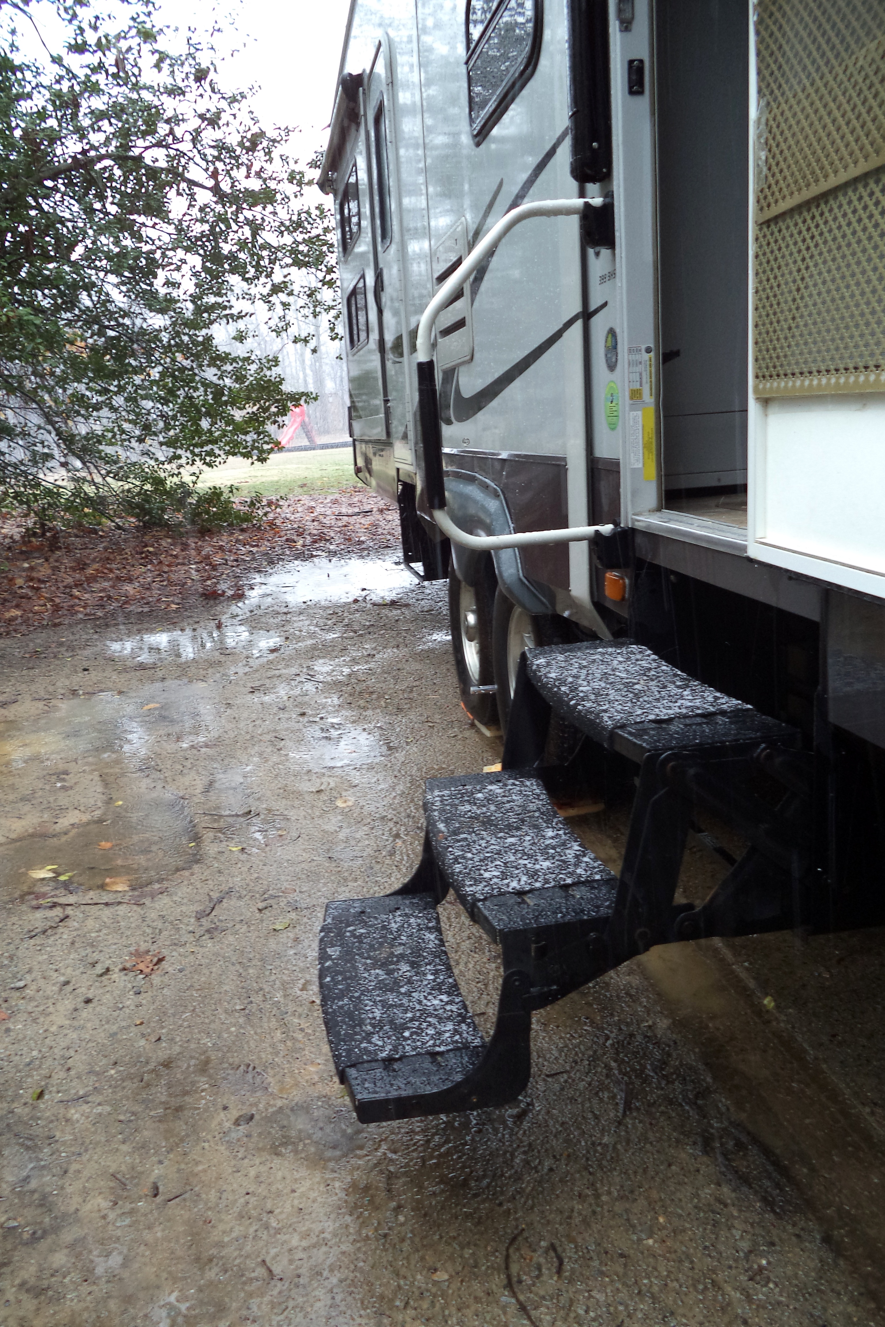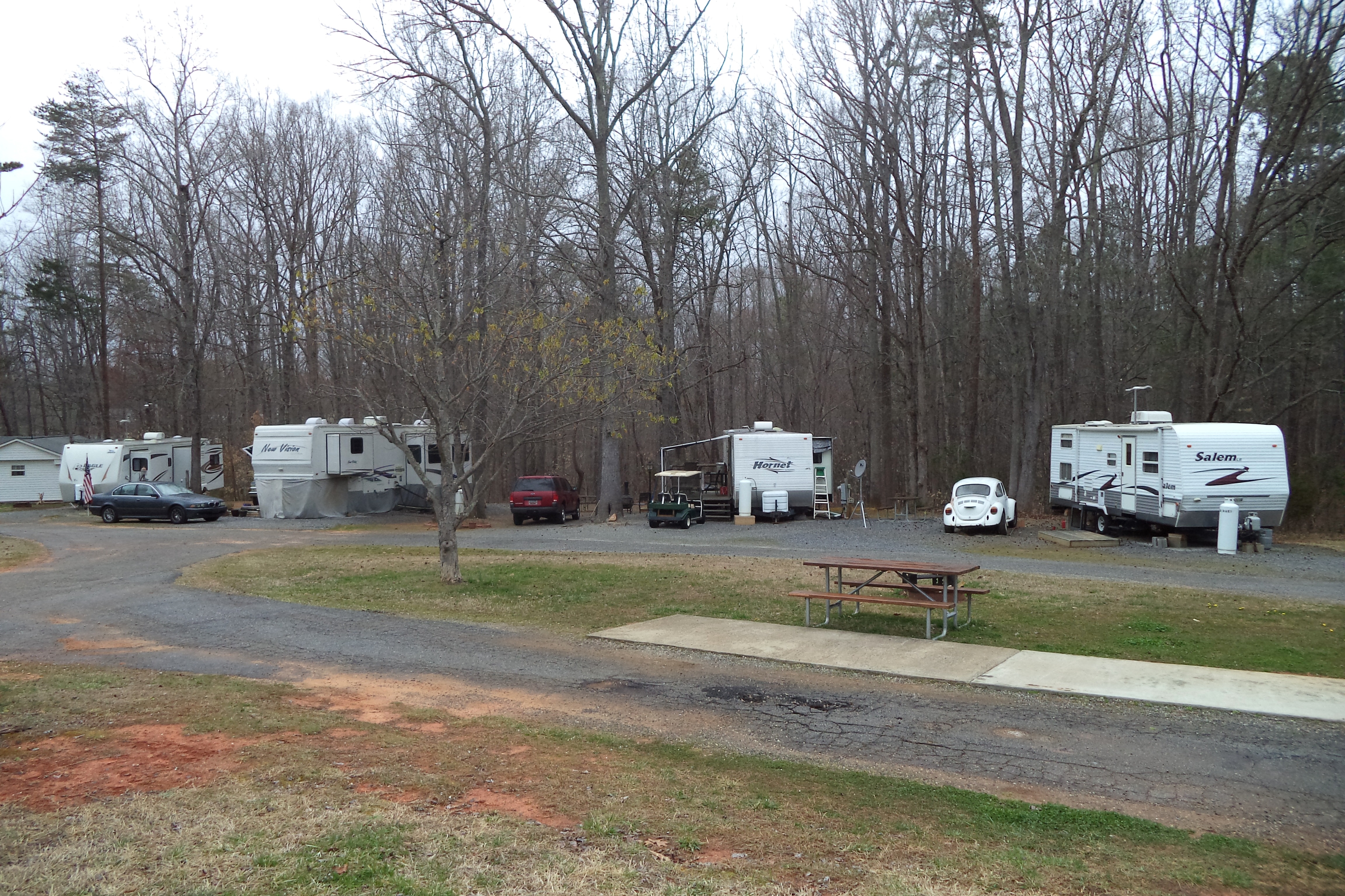 It was gloomy all day, but not particularly cold – in the 60s most of the day. The road was relatively flat. We stopped for gas in Mebane, NC, about 20 miles short of our planned refueling stop. I had made the mistake of filling the truck’s tanks before going to Walmart for some supplies, forgetting how far Walmart was from the RV Park, so I had 15 miles on the odometer before we even hitched up. That made the planned stop a bit of a stretch.