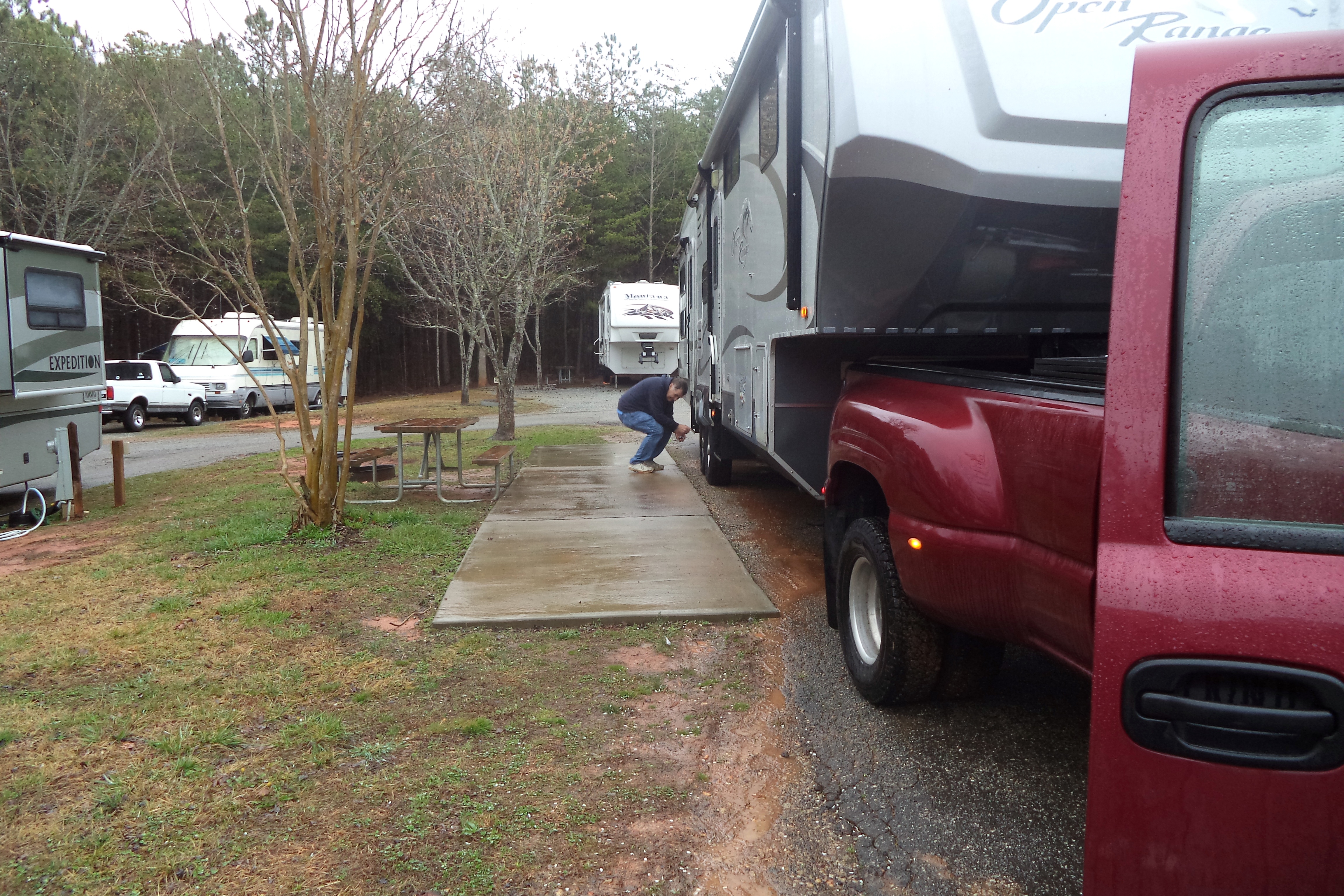 I thought the roads in the Pine Ridge Campground were bad, but the roads in Lake Gaston were worse. We had a pull-through but I determined that the only way out of the pull-through was to back out. Not much of a pull-through. And when I took the garbage to the dumpsters (another park with no trash pickup), I just about buried the truck in red mud.