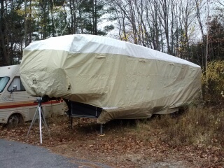 So with all hope of a warm winter dashed, we had to winterize the RV. That meant (1) putting anti-freeze in the water lines and (2) covering the entire RV to protect against the elements.