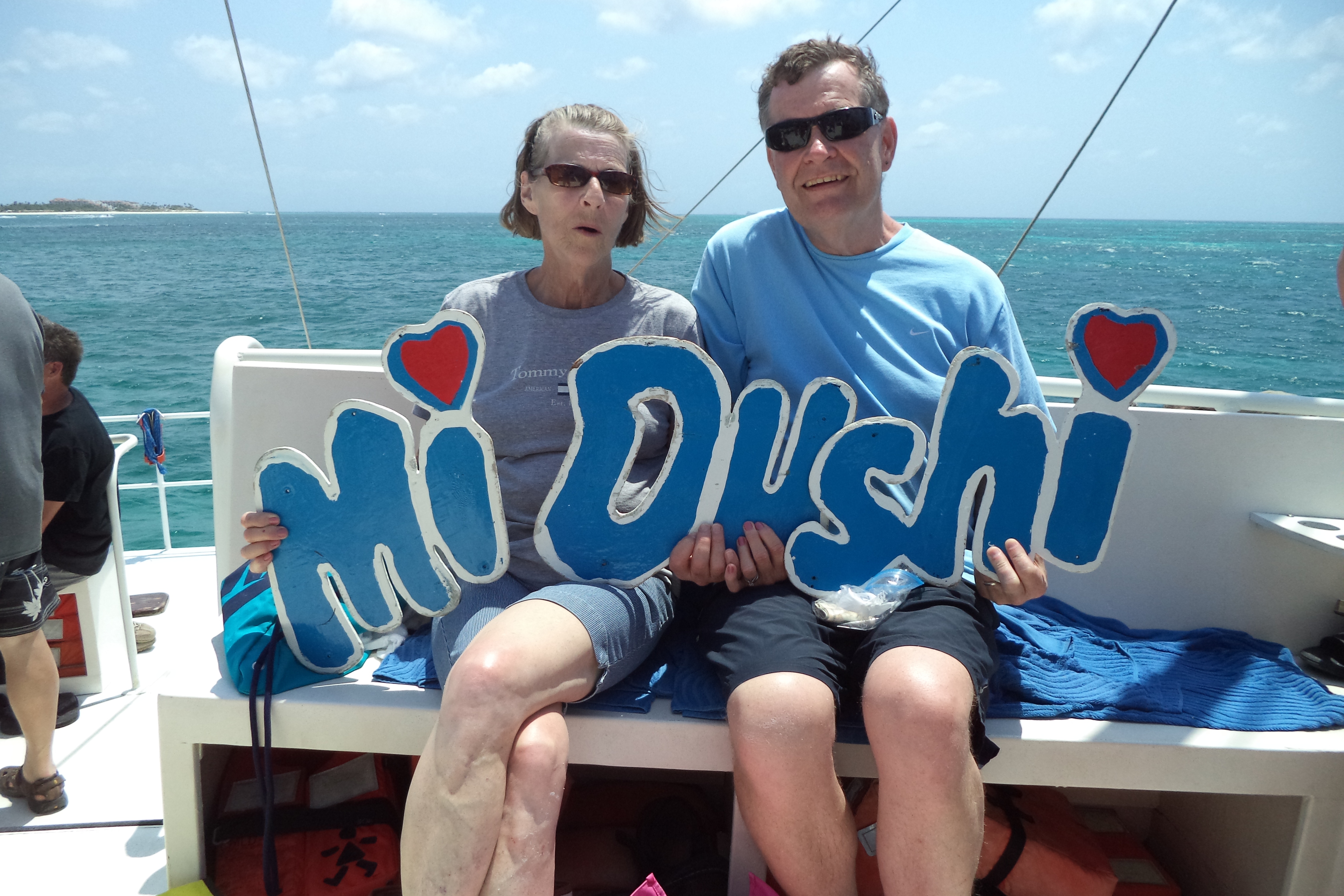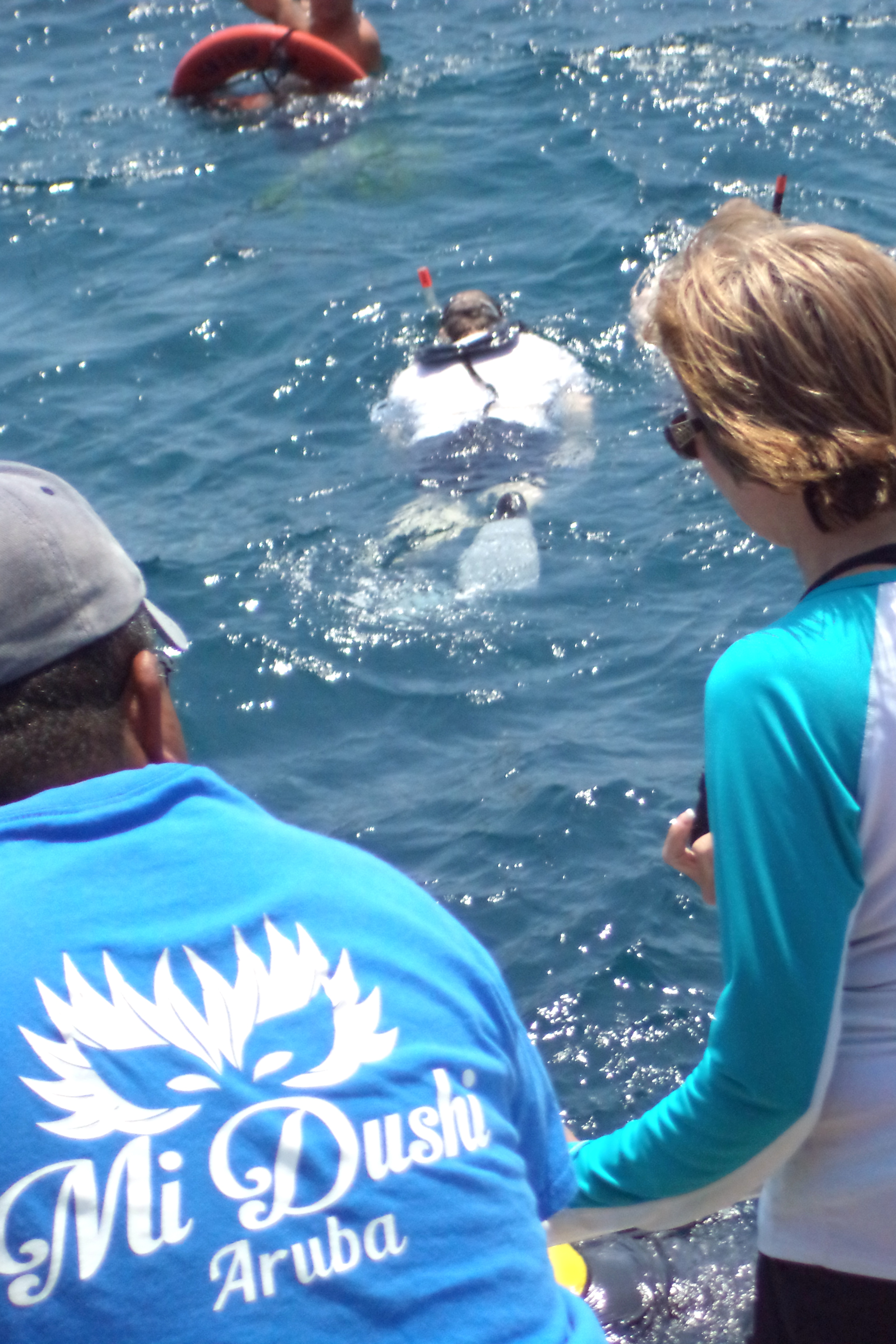 The snorkel boat was the Mi Dushi – “my sweet” in the local Dutch dialect. We traveled for 40 minutes to get to the first snorkel site, then visited two more before returning to the Breeze. Total excursion time: 5.5 hours – long enough to get a serious sunburn, which we did. I fried my face (I have gone through 3 layers of skin since the end of the cruise) and even burned my scalp. But I had only minor burns elsewhere. Jett got a nasty burn on the tops of her feet – very painful – but apparently was smarter about protecting her face as she did not peel at all.
