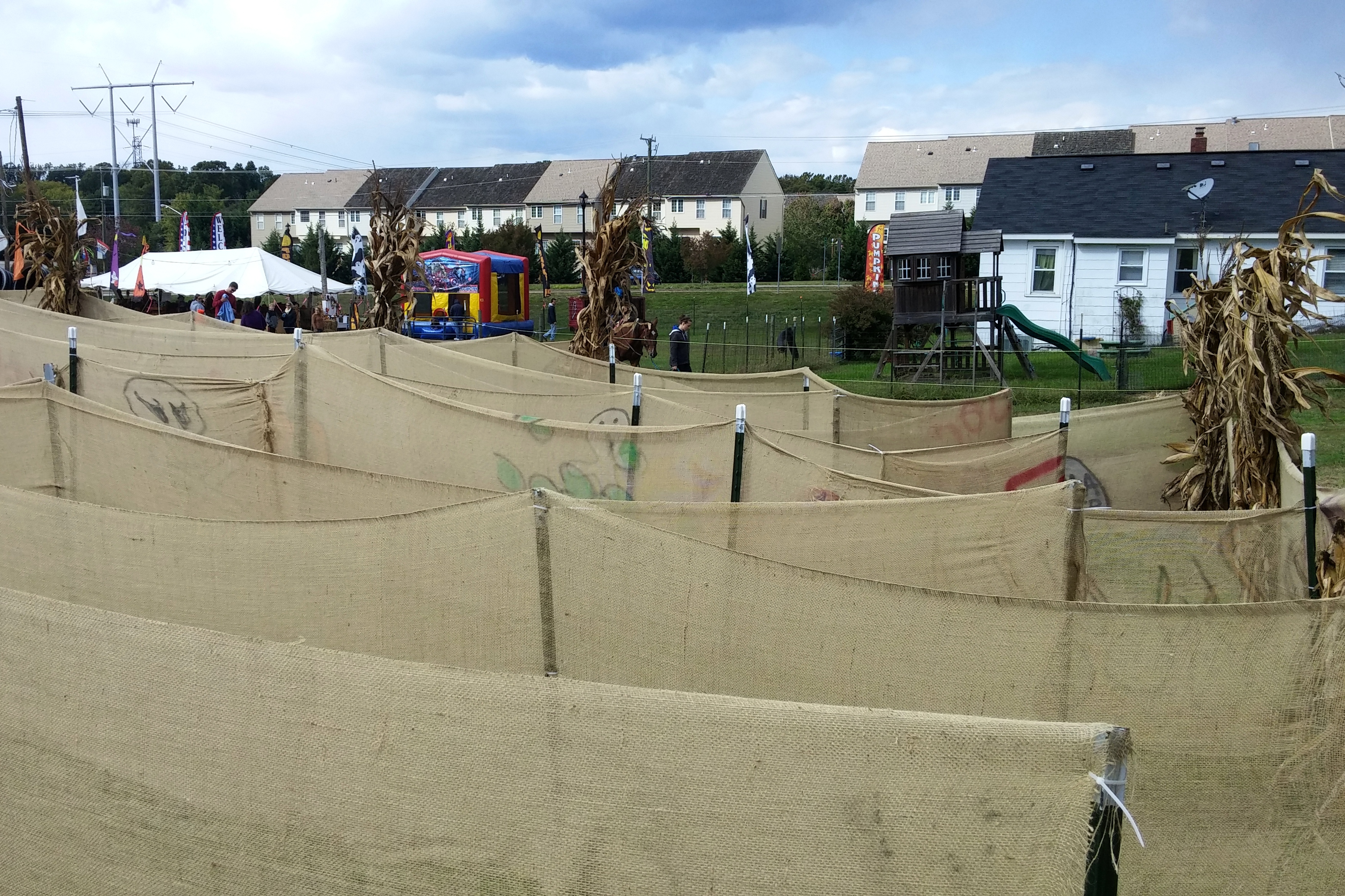 But I digress. What I wanted to describe was my own, personal, introduction to the pumpkin patch lifestyle. I accompanied Zachary (who apparently had not overdosed on pumpkins on his field trip) and his dad to a small pumpkin patch event in Woodbridge VA. It wasn’t much as festivals go, but it was a cold day and we didn’t want to stay long anyway. It did offer a bouncy house, a tractor-pulled train ride and a hayride. It also had a really cheesy maze which took about 2 minutes to navigate.