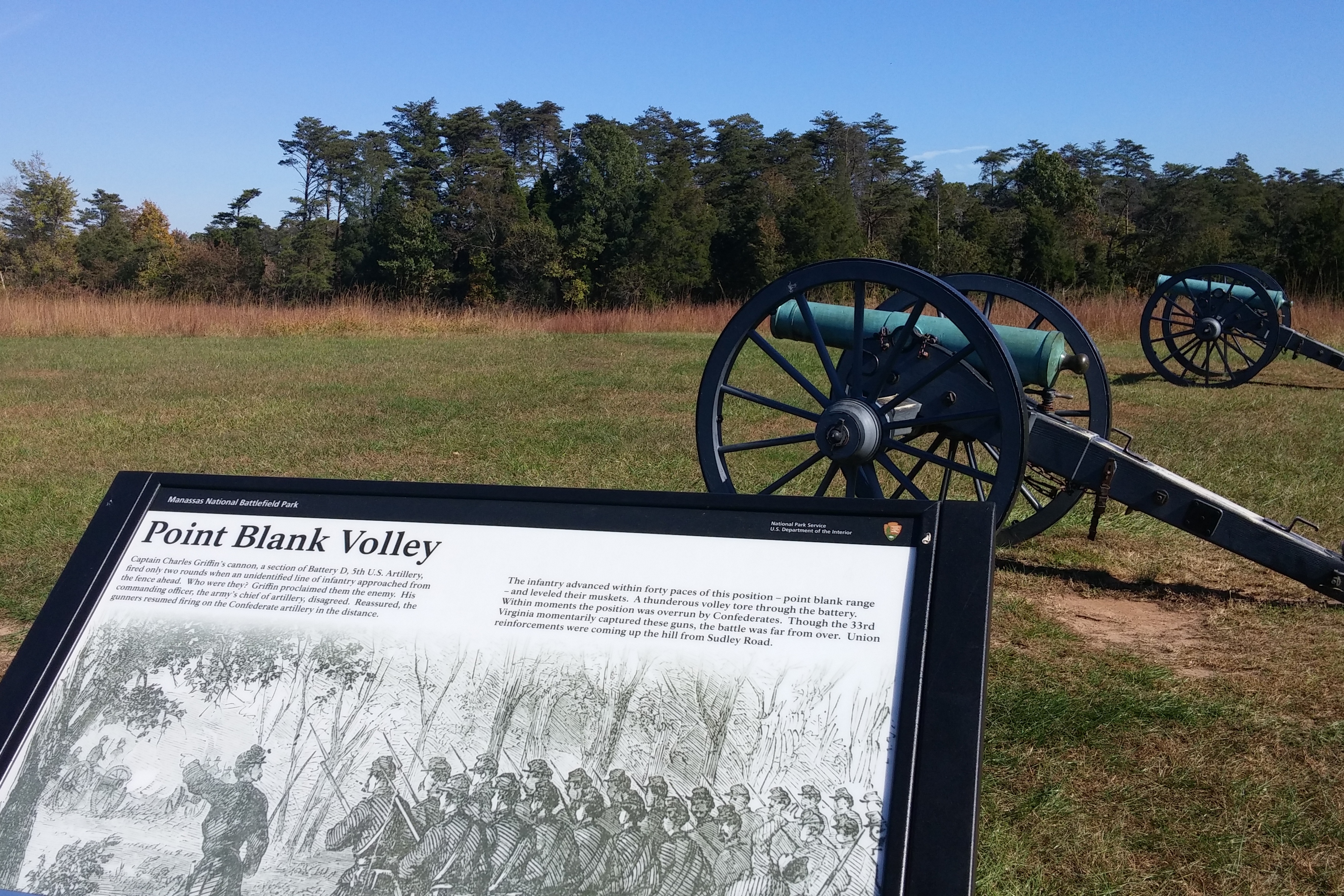 For reasons that are not obvious, the Union deployed two cannon at that side of the line and positioned them to fire at the Confederate artillery, completely ignoring the Confederate infantry less than 200 yards away. The Confederates at that location were wearing blue uniforms, probably because the army had not yet fully standardized on gray as the color for Confederate uniforms. In any case, the Union batteries, when then saw them approaching, assumed they were friendly. They realized their mistake too late and the two cannon were captured. There was additional fighting back-and-forth, but this capture of the federal cannon is widely regarded as the key turning point in the battle.