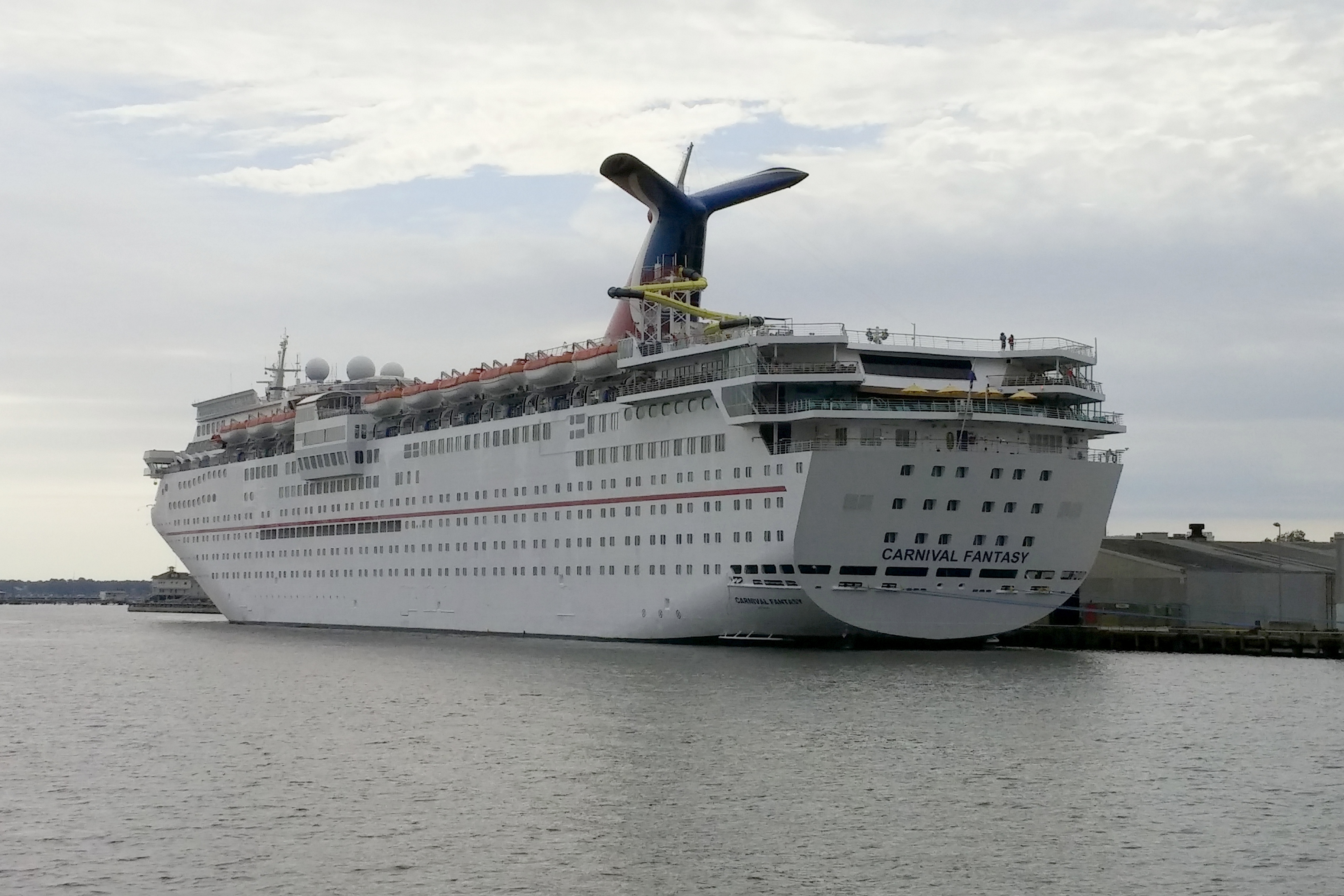 To balance the Yorktown, the opposite (Charleston) side of the harbor has a passenger cruise terminal. The cruise ship in dock that day – the Carnival Fantasy – is as imposing as the Yorktown. In fact, it is both longer and has a much larger displacement than the Yorktown. Obviously, shipbuilding technology has come a long way in 60 years.