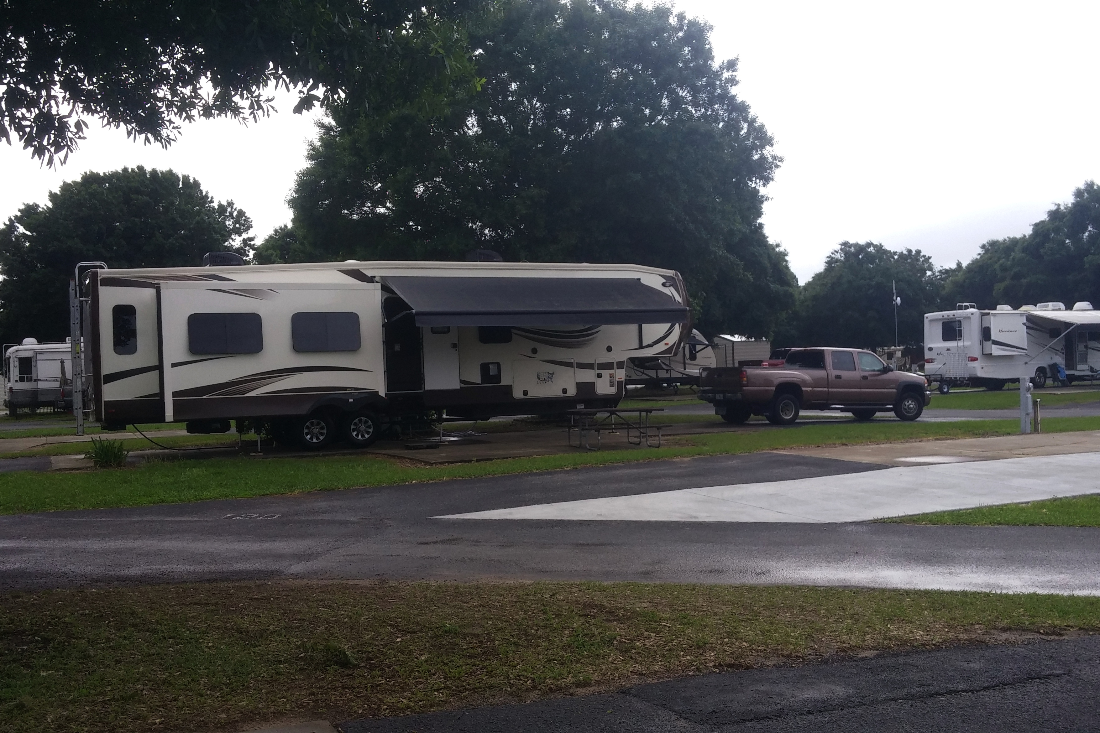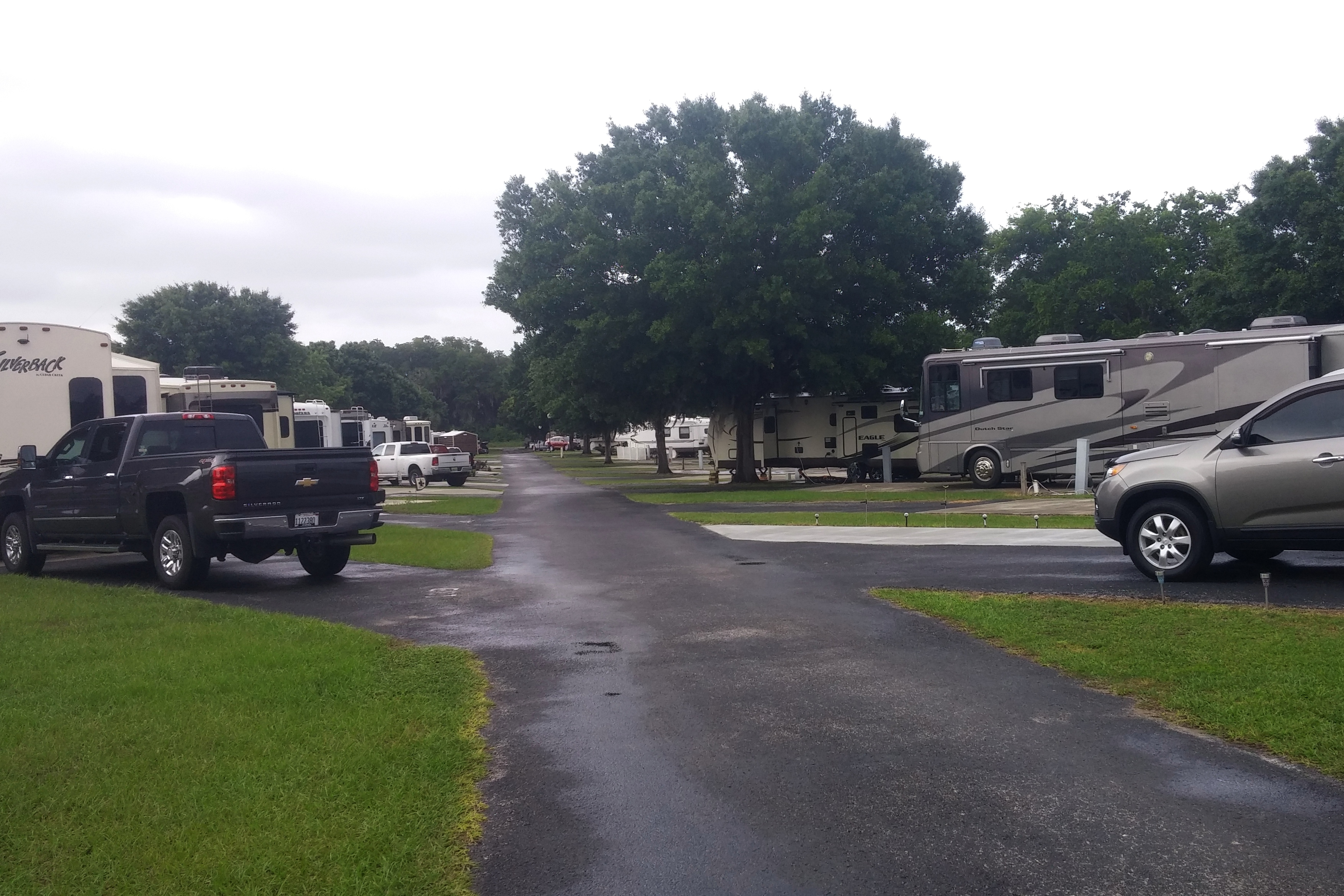Our home for the evening, as previously mentioned, was the Grand Lake Golf and RV Resort in Citra, FL. This is a very large (estimate: 500 sites) RV park with many park models and long-term residents. But no trashy long-term residents. All the RV units were newer and in good repair. But many sites had landscape improvements and quite a few had permanent steps and/or wooden decks. I think sites could be owned as the reception desk was labeled “Sales Office”.