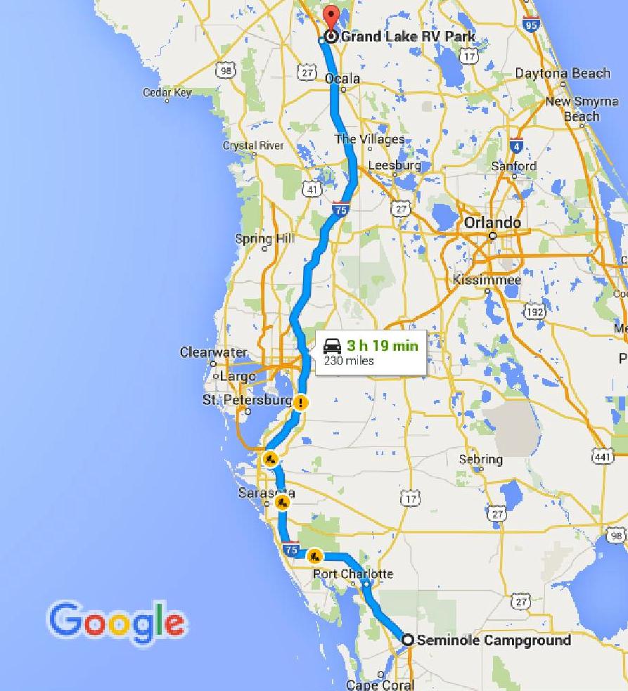 About 210 of the 230 miles were on I-75 and about half of those were construction zone. The scenery consisted of orange barrels. Lanes were dropped or narrowed over long stretches. If it had been the weekend – or even Friday, I think – it would have been very unpleasant. But midday Thursday wasn’t too bad. Even Tampa, which is seemingly always backed up, flowed pretty well.