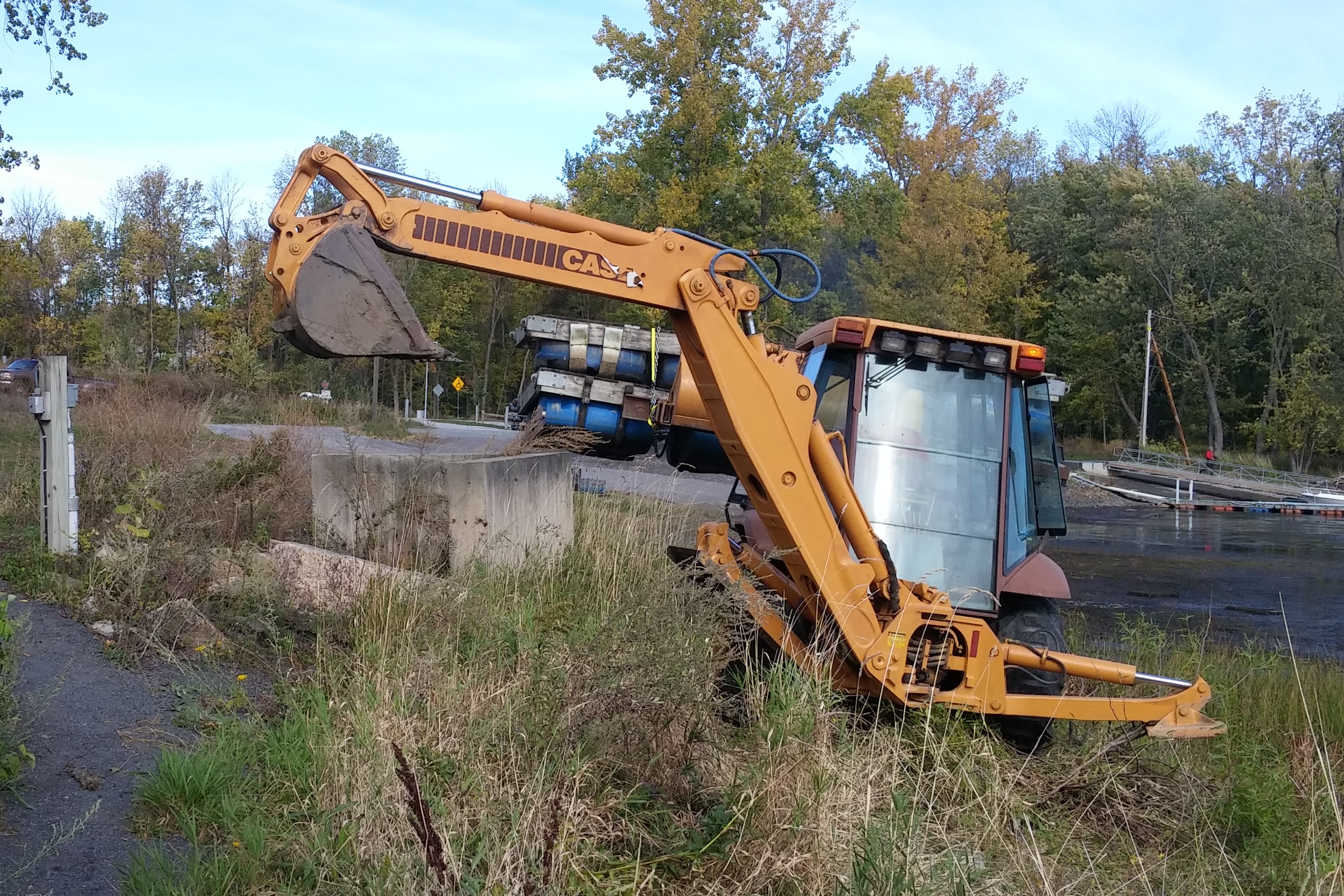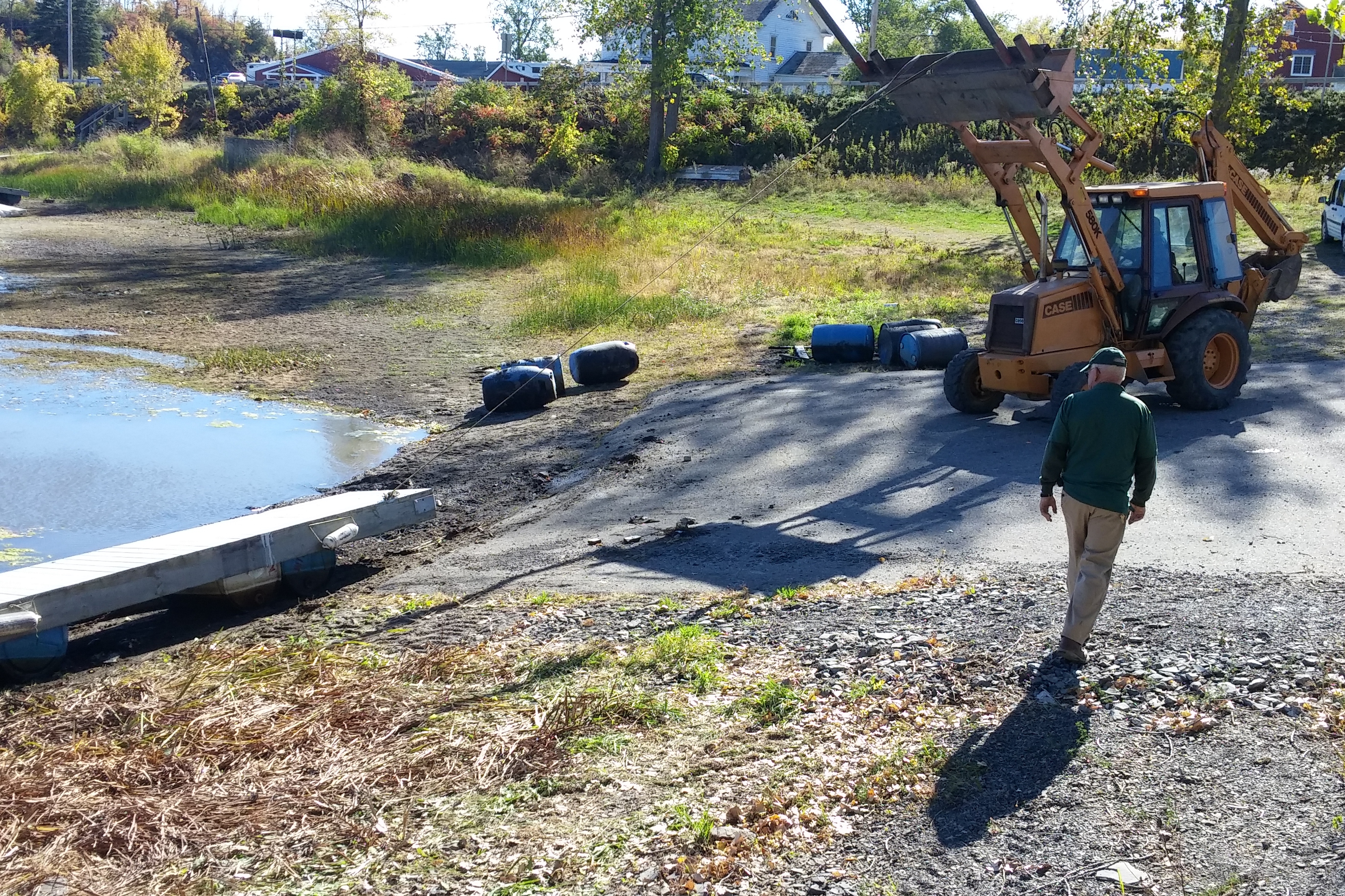 The launch dock came out first. I had started that process a week earlier by detaching the four segments that were still floating and tying them to the gas dock. I then removed the pins that connected the other 8 segments and just left them sitting in the mud. When the front-end loader arrived, it was used to drag all 8 of those segments to shore where they could then be lifted and stacked. The 4 floating segments were then floated to near the shore where they were also lifted and stacked.