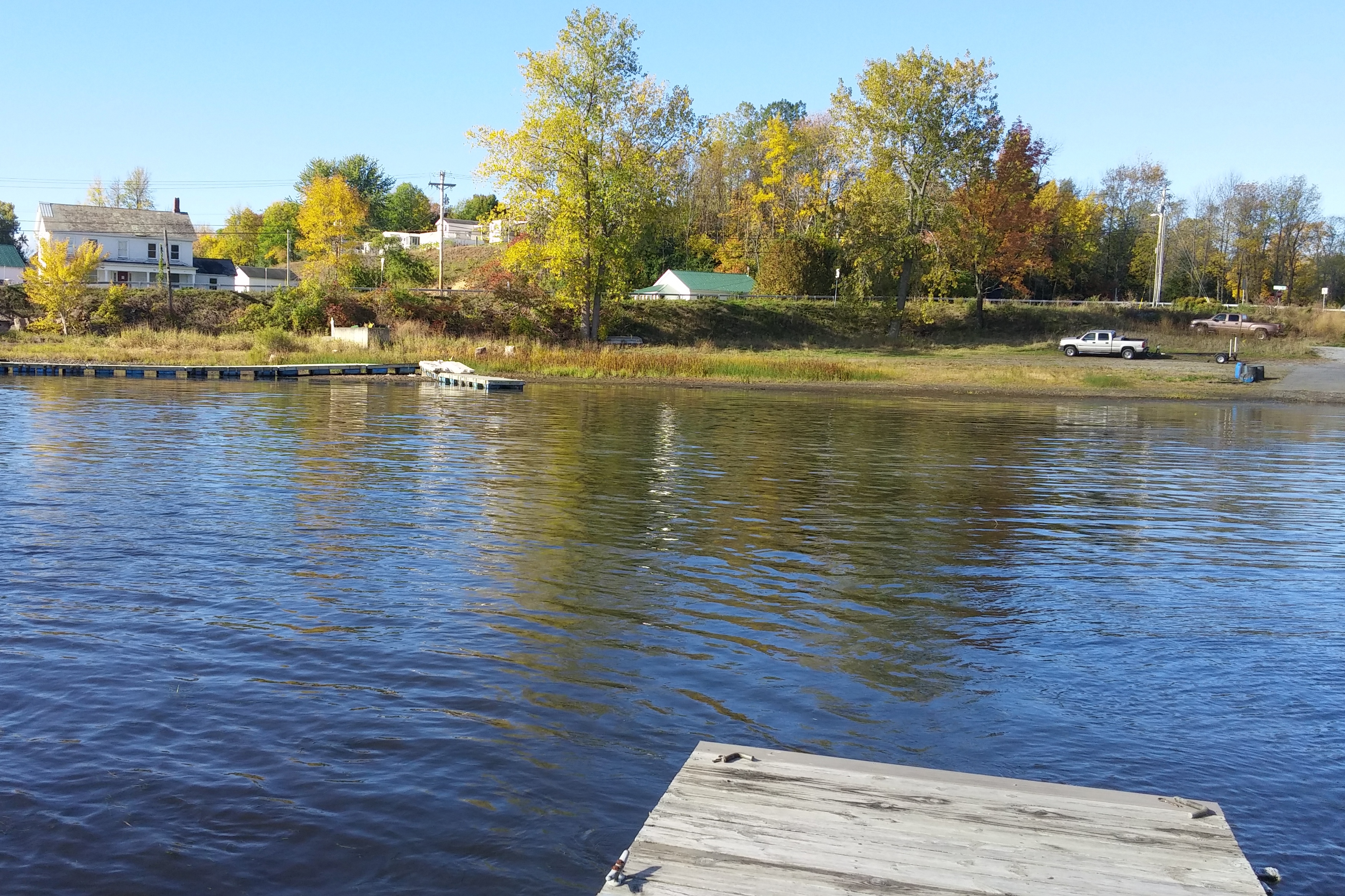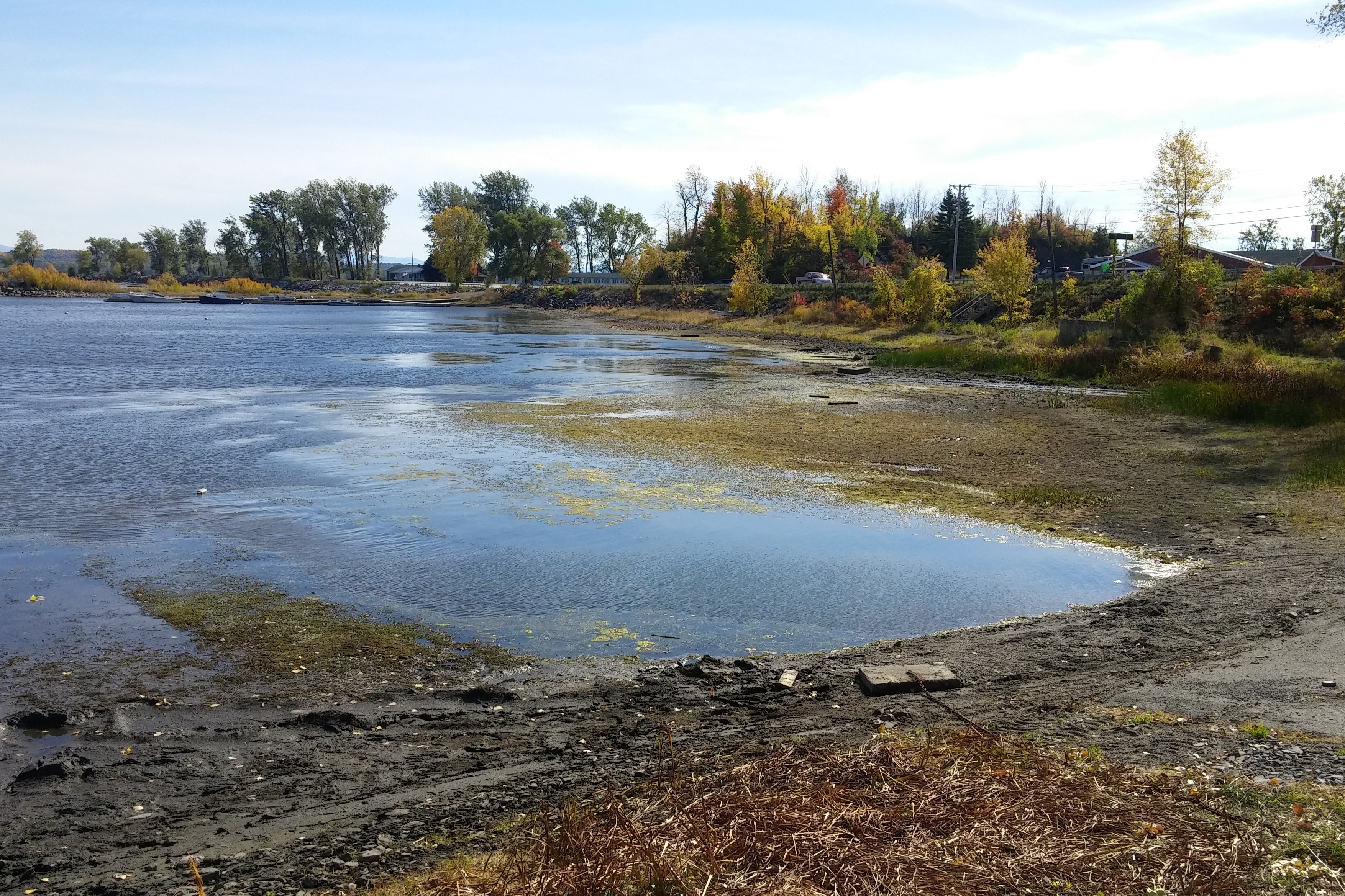 The final task in my marina mini-career was taking out the docks. The floating docks had to be removed from the lake and stacked on shore, to keep them from being crushed by the winter ice. This is normally a simple task, taking maybe a day and a half. This year it took a bit longer, due to the near-historic low water on Lake Champlain: the level when we started removing the docks was about a foot below the 100-year median and less than 6″ above the all-time low water of 1941. About a quarter of the dock segments were sitting on the mud and had to be dragged and/or lifted out of the non-existent water.