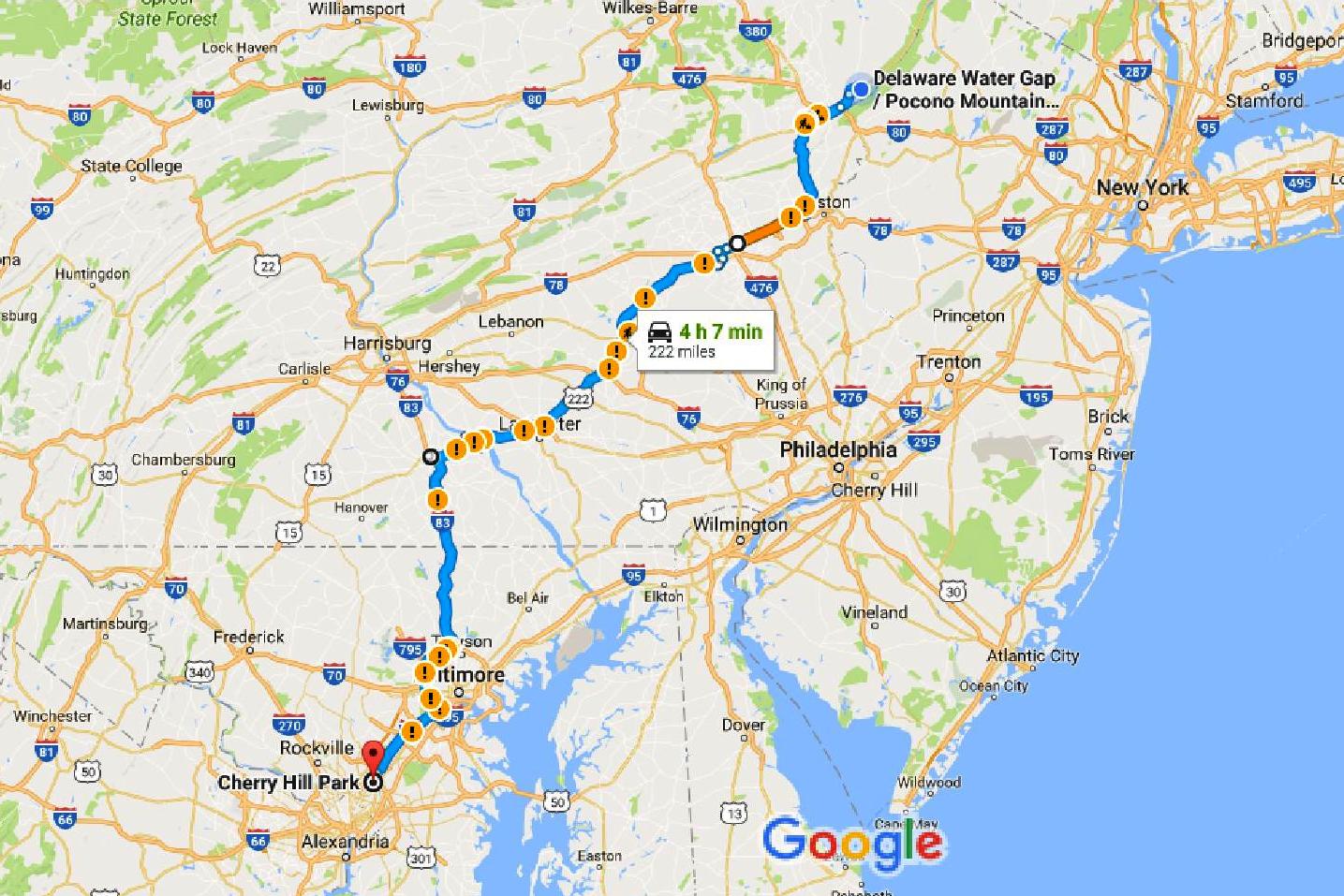 222 miles via US 209, PA 33, US 22, US 222, US 30, I-83, I-695 (around Baltimore), I-95 and MD 212. Cumulative tow miles: 680.
