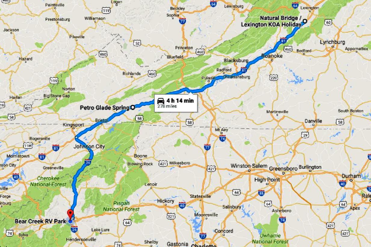 This was another “easy” hop in terms of navigation: down I-81, then down I-26 to Asheville. But it was a long trip, with a refueling stop, and a couple of problems arose. First, some rubber molding on the RV came loose several times, requiring uncomfortable emergency stops on I-81. After the third failure I had to dig out some Gorilla Tape to keep it in place. Second, I changed the refueling stop and made a mental note of its location: Exit 63 on I-81. But Mile 63 came and went and there was no Exit 63. So we kept our eyes open and picked a Petro Truck Stop at Exit 26. We got fuel and lunch at the Iron Skillet (a first – they make a pretty good grilled chicken sandwich) and got back on the road. Later, in Tennessee, we passed Exit 63. My memory had the right exit but the wrong state.