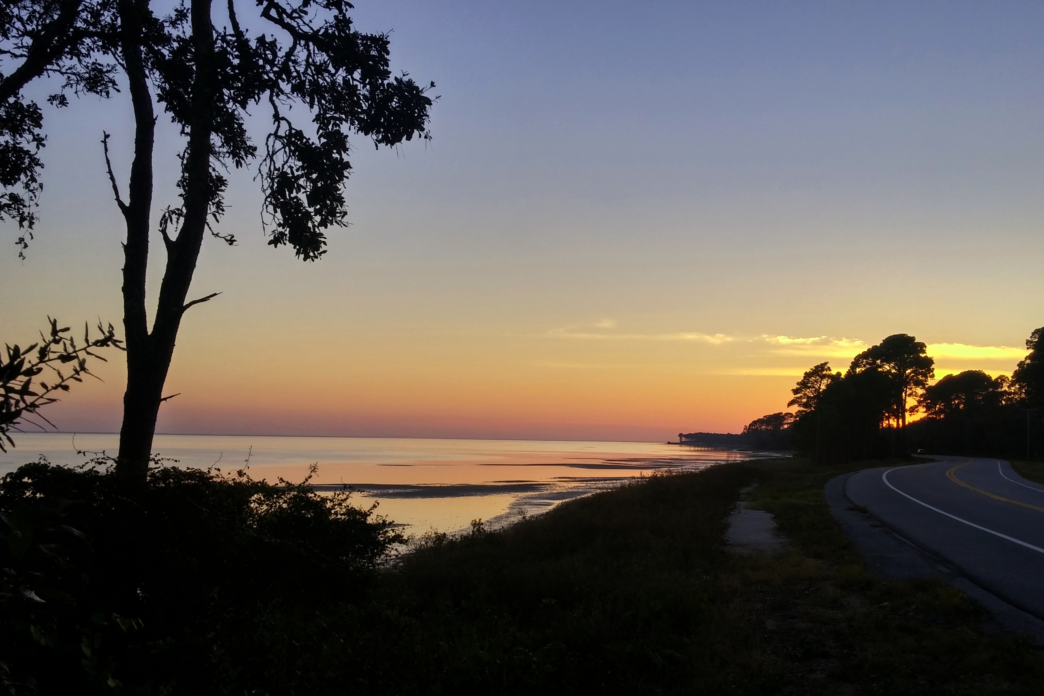 First, we, quite by accident and more due to laziness than an actual plan, headed west into Carrabelle just in time to catch the sunset. The spectacular, breathtaking sunset. I simply admired it for a few miles, then realized that I should be taking a few photos. I caught the tail end of the sunset, so some of the colors had faded, but it was still stunningly beautiful.