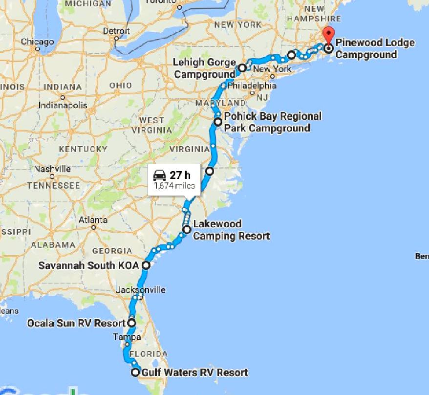 We will leave Ft Myers Beach on April 14 and expect to arrive in Massachusetts on May 5. We will cover the 1,673 towing miles in 8 hops:
