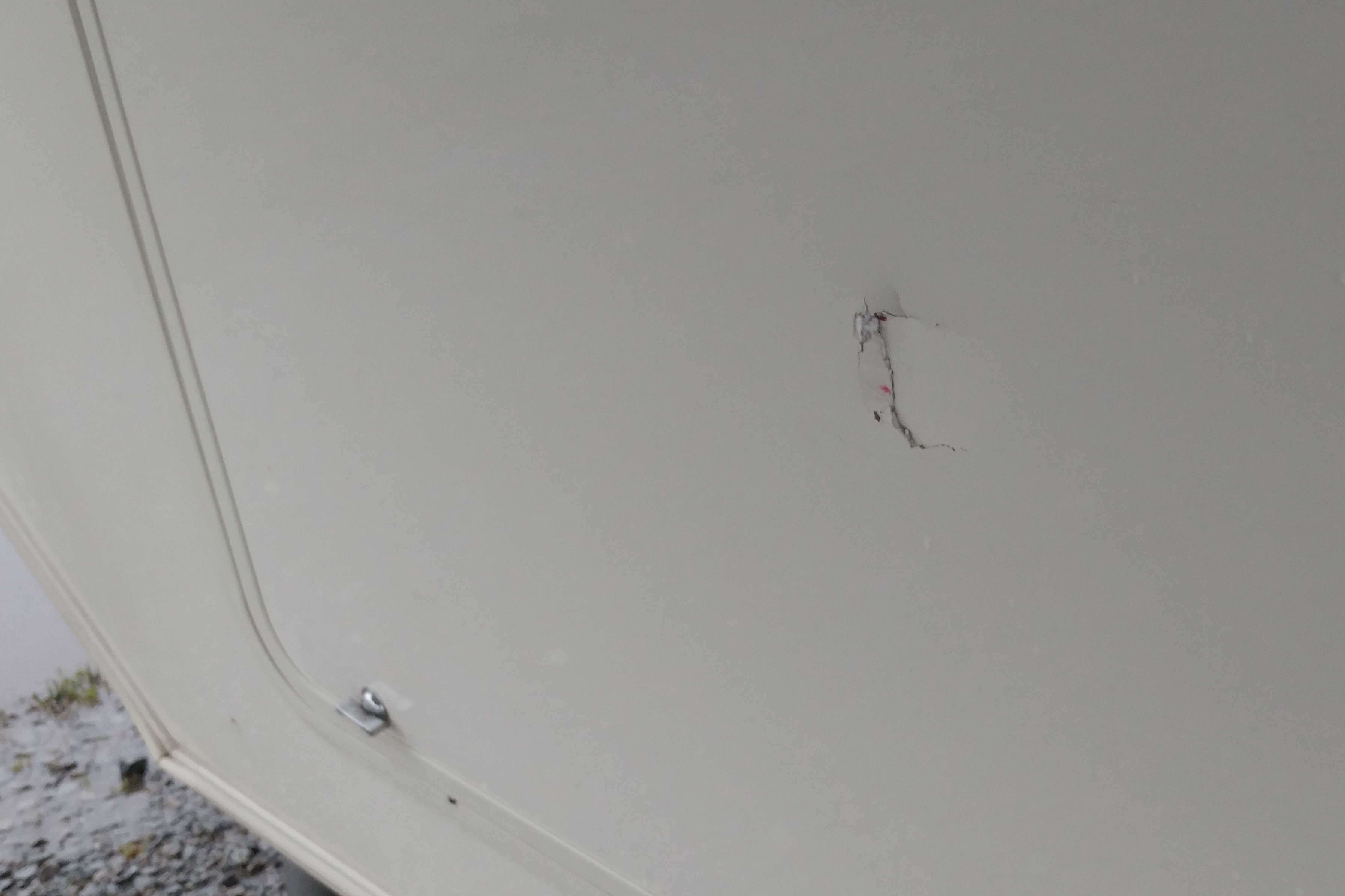 There were a number of events and conditions that made this hop interesting, starting with the rain. It rained all day – heavily at times. That alone made it one of the more difficult hops in our four years of travel. Second, I had to hitch up with the truck at an angle (see photo) and misjudged how much room I had with the tailgate down. I thought I could do it. I was wrong. The result was that the corner of the tailgate crunched a hole in the skin of the front basement. The first real ding of the trip. And hopefully the last.