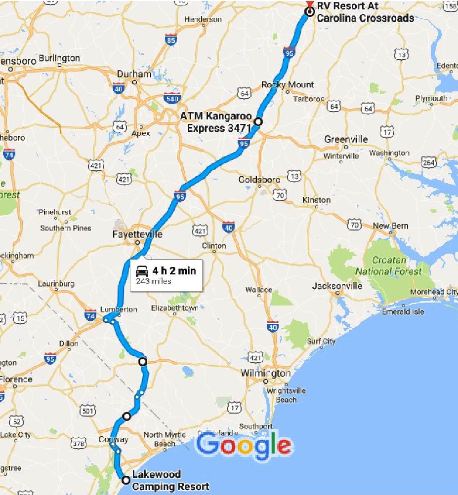 244 miles via SC 544, US Business 501, US 701, NC 410, US 74 and I-95 with a refueling stop. Cumulative tow miles: 893. Cumulative truck miles: 1104.