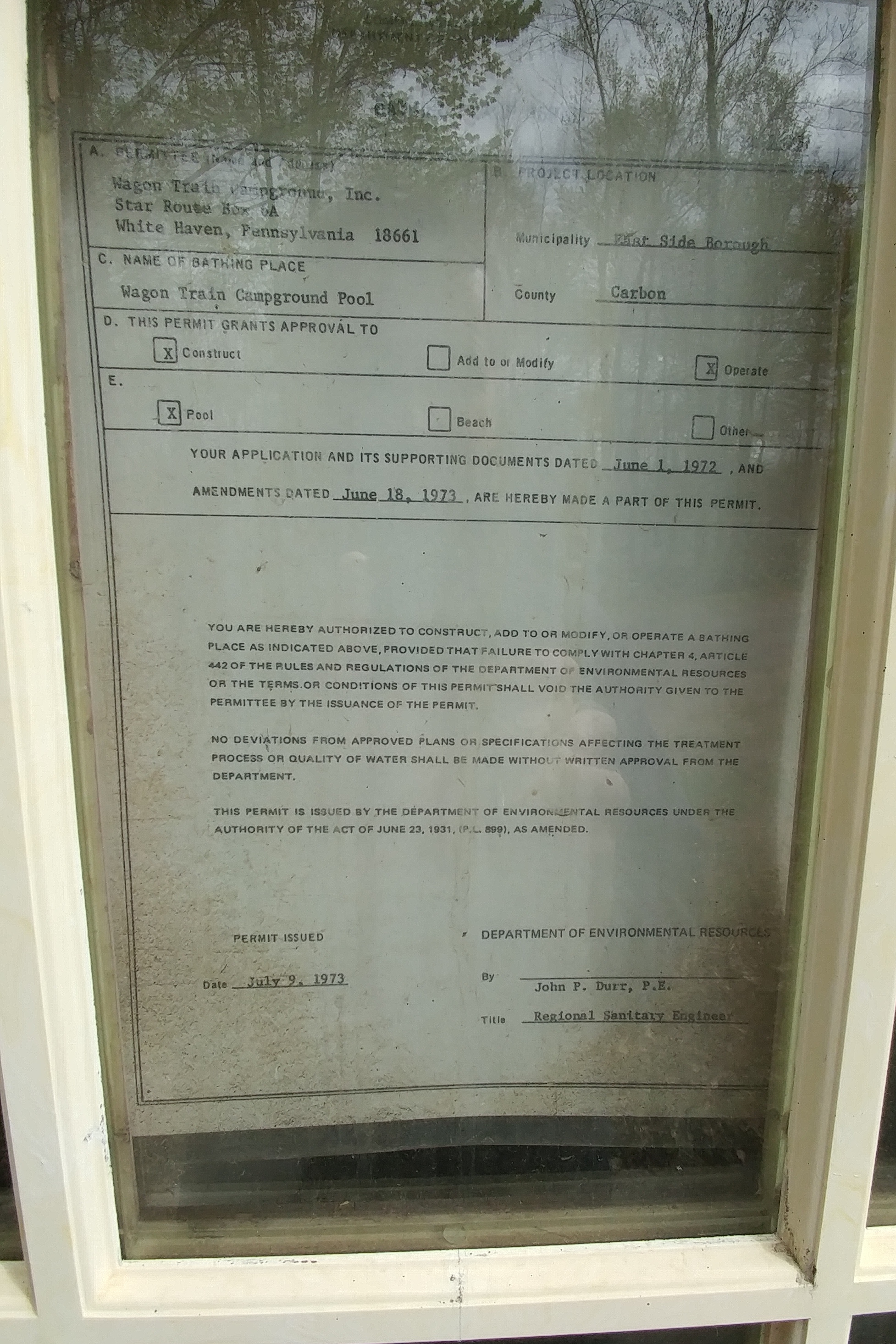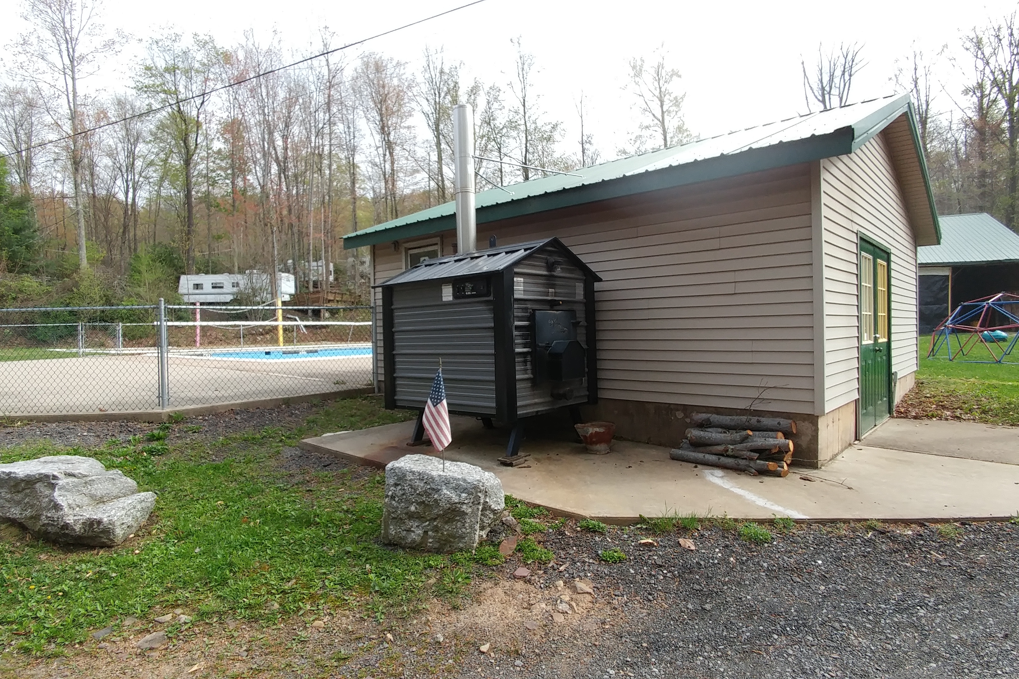 We didn’t care about the pool, the playground or the laundry, but the park has all of those. The pool is unique in that it is heated by a wood-burning furnace. The storage shed next to the furnace had a “bathing place permit” posted. I guess the local government licenses commercial swimming pools. But the posted permit was dated July 9, 1973 – almost 44 years ago! I guess you don’t need to renew the permit very often.