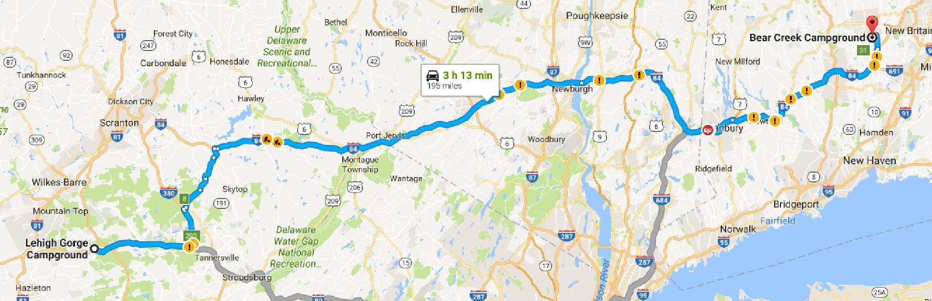 198 miles via I-80, I-380, PA 423, PA 191, PA 507, I-84 and CT 229. 198 miles. Cumulative tow miles: 1511. Cumulative truck miles: 1920.