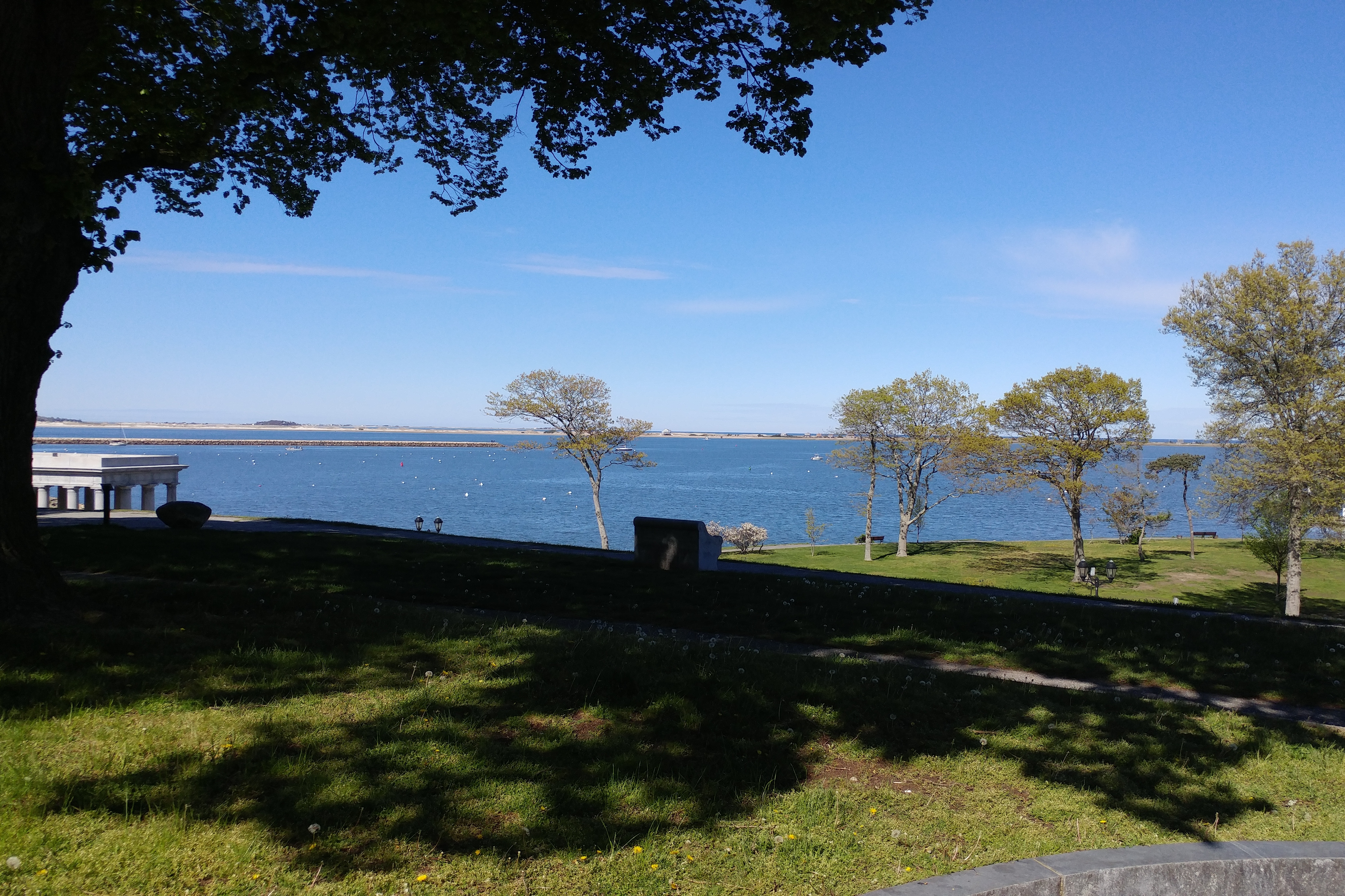 The hill is near the Plymouth Rock pavilion which houses Plymouth Rock – ostensibly the rock on which the Pilgrims first set foot on shore in Plymouth. I am skeptical, of course, that anyone bothered to mark the location where they first set foot. And in any case it is NOT the first place where they set foot in America as they landed first near the tip of Cape Cod, then worked their way along the shore of Massachusetts Bay until they found a suitable location for a settlement. The rock itself is unimposing, being about 5 feet long and 3 feet wide and tall. Like a billion other rocks along this shore. I took a photo, but it was late afternoon and the lighting was terrible.