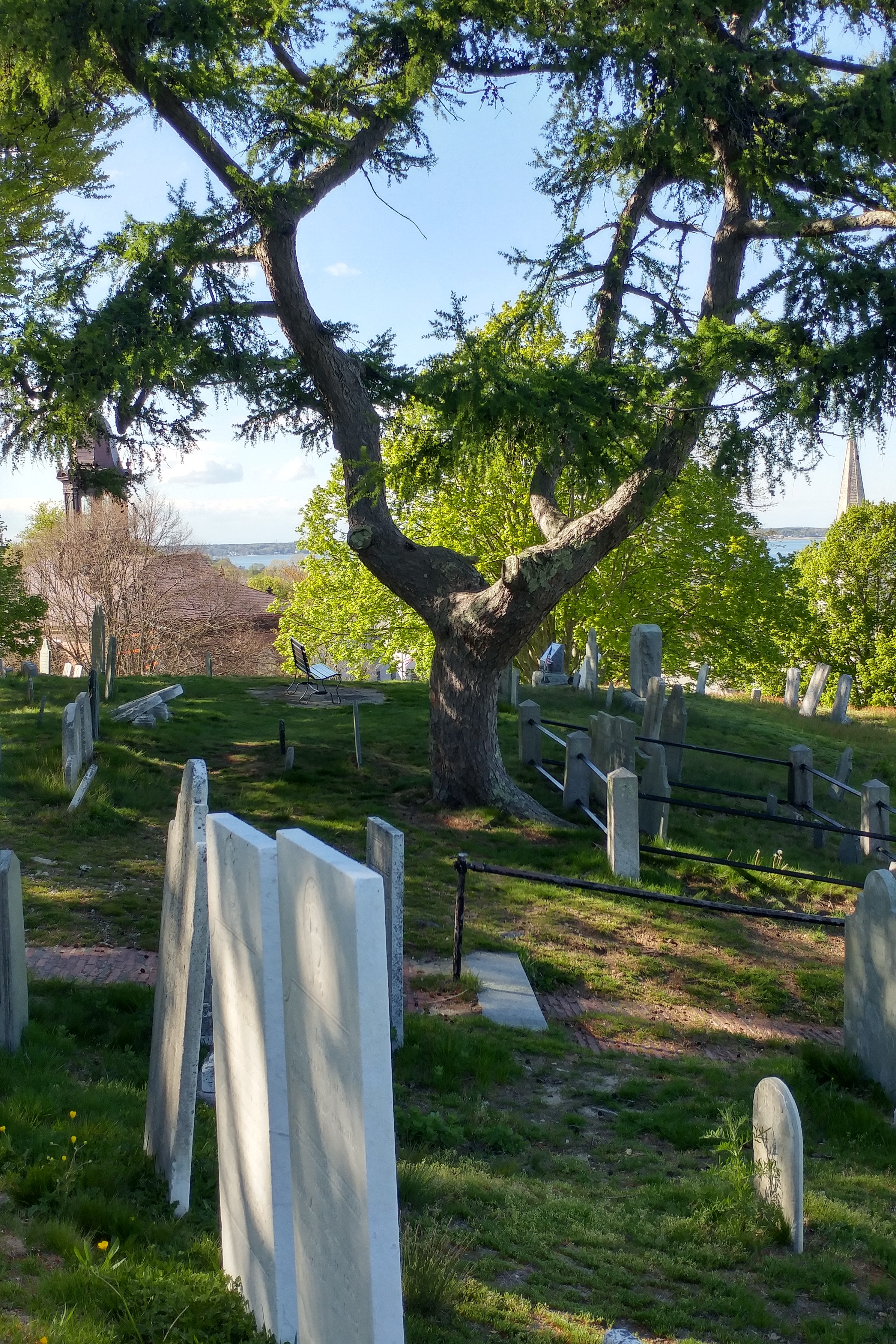 Jett has at least one ancestor – Elizabeth Walker Warren, died 1673 – who is buried in a nearby cemetery in Plymouth – Burial Hill, the first “real” cemetery in Plymouth. It is a large cemetery and, being very old, many of the headstones are illegible. I had no realistic expectation of finding her headstone, but it was a beautiful cemetery with spectacular views over downtown Plymouth and out to sea. Walking through a cemetery like this and taking the time to reflect on the courage and fortitude of the early settlers is never a waste of time.